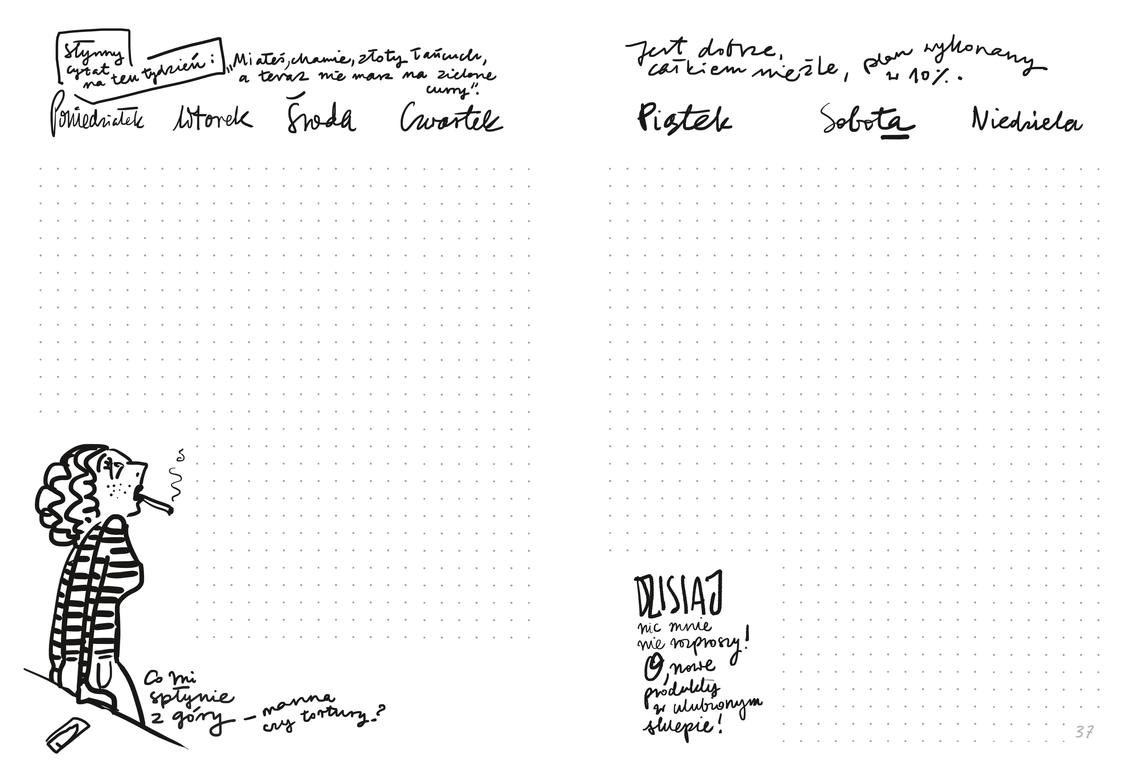 Ilustrowany planer stworzony przez Magdę Danaj, autorkę popularnych Porysunków, która w swoich grafikach lekko i z humorem portretuje codzienność – czasem gorzko, czasem ironicznie, ale zawsze celnie. ·planer ·pamiętnik ·notes ·ilustrowany album do planowania ·porady life coacha ·cytaty motywacyjne i antymotywacyjne ·rysunki współodczuwające Planer wyjątkowy. Bo to coś więcej niż planer. To towarzysz codzienności – powiernik planów podboju świata i koślawych bazgrołów. Pamiętnik chwil ulotnych i dziennik prozy codzienności. Nieoceniający trener najtrudniejszej dyscypliny zwanej życiem. Powyższy opis pochodzi od wydawcy.