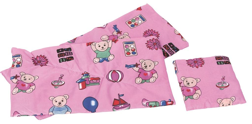 Zestaw kolorowej pościeli do łóżeczek i kołysek dla lalek składający się z: materacyka 56x24cm, kołderki 49x27cm, poduszki 21x20cm. Dostępny w różnych wariantach kolorystycznych.