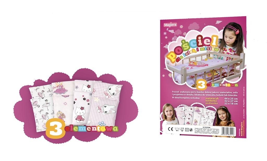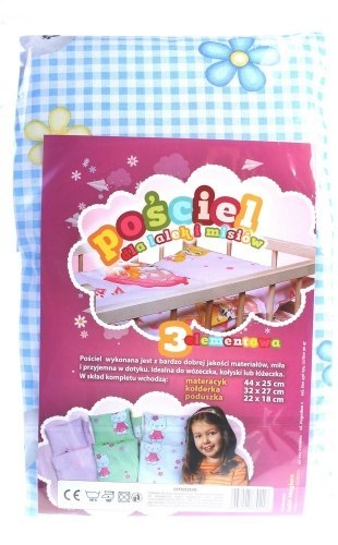 Idealna do wózka dla lalek, kołyski lub łóżeczka. Zestaw jest dwustronny, zarówno kołderka jak i poduszka wypełnione są antyalergiczną puszystą włókniną. W skład 3 elementowego kompletu wchodzą: