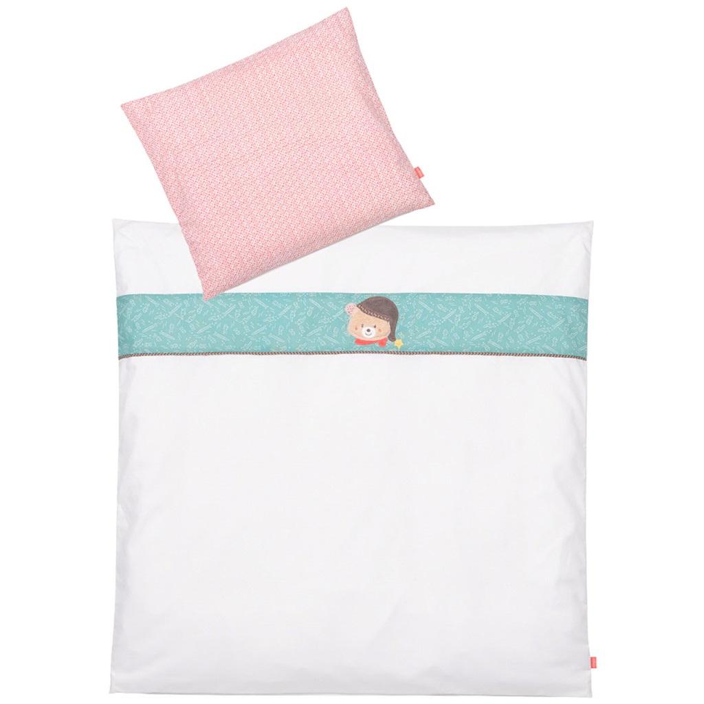 Pościel do łóżeczka, komplet, z kolekcji: Bruno Magiczna pościel dla każdego maluszka. Wykonana z najwyższej jakości materiałów. 2 - częściowy komplet pościeli ozdobnej składający się: z powłoczki na poduszkę o delikatnym wzorze oraz powłoczki na kołderkę ozdobionej elegancką aplikacją przedstawiającą główkę misia Bruno. Wyjątkowa miękkość i delikatność tkaniny sprzyja relaksowi i umila sen dziecku. Zapakowana w elegancki przeźroczysty pokrowiec z wygodnym uchwytem. Wraz z innymi produktami tej samej serii, np: maskotką z grzechotką, termoforem z pestek wiśni, ręcznikiem z kapturem, kocykiem lub pokrowcem na przewijak, może stanowić doskonały prezent na chrzciny czy 1 urodziny. Materiał: 100% bawełna, nadruk - 65% poliester, 35% bawełna. Zaawansowana technologia użyta w produkcji tej tkaniny sprawia, że jest bardzo trwała i przewiewna. Gwarantowane bezpieczeństwo i jakość produktu, zachowanie odpowiednich atestów i certyfikatów. Pranie w temp. 60 C. Wymiary: poszewki na poduszkę - 35 cm x 40 cm., zasuwana na suwak. Wymiary: poszewki na kołderkę - 80 cm x 80 cm., zasuwana na suwak. Wymiary opakowania: 30 cm x 30 cm x 3 cm. Wszystkie artykuły niemieckiej marki FEHN są bezpieczne dla dzieci od 0 lat. Wykonane są z najlepszej jakości materiałów. Spełniają normy EN71, CE, badane w instytutach Stiftung Warentest lub kotest.