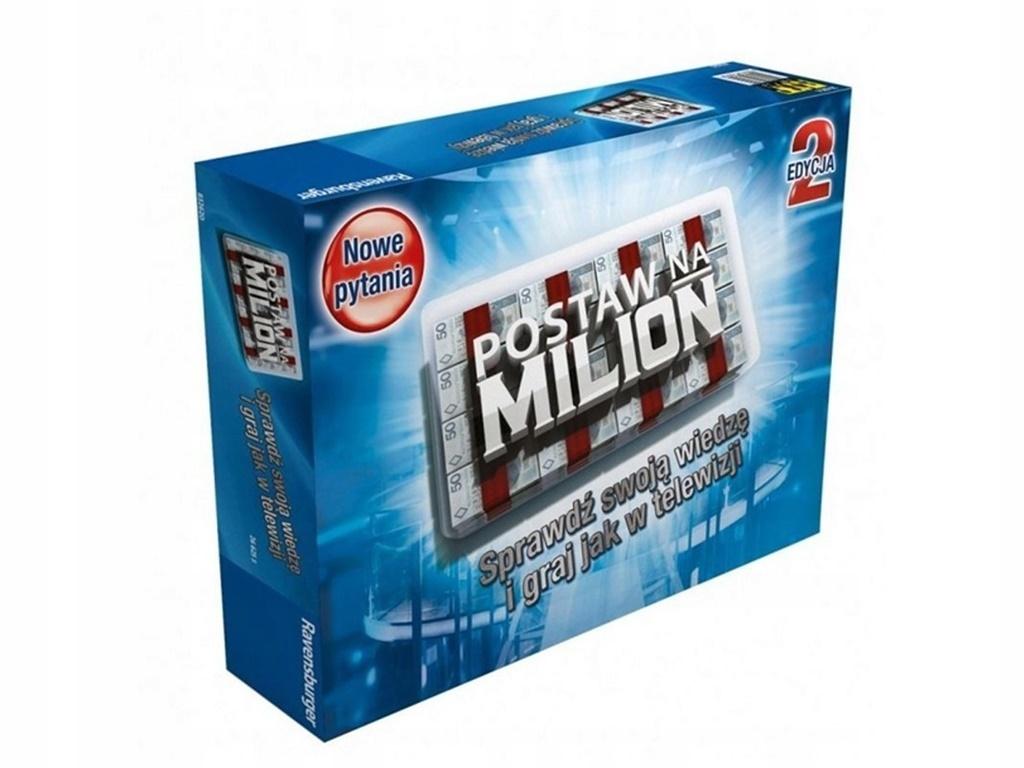 Chciałbyś wygrać milion? Musisz poprawnie odpowiedzieć na 8 pytań. Zaczynasz grę z milionem złotych i próbujesz z nim przejść przez 8 pytań. Znasz poprawną odpowiedź? Brawo! Zachowujesz pieniądze, które postawiłeś na tę odpowiedź i grasz dalej. Postaw na milion to gra, która wciągnie każdego, niezależnie od wieku. Liczy się wiedza i wyczucie, tak samo jak w teleturnieju. Zawartość: plansza 40 plików pieniędzy, każdy po 25 000 zł 200 kart z 400 pytaniami 2 karty zasłaniające licznik rund. Liczba graczy 2-6 Wiek 12+