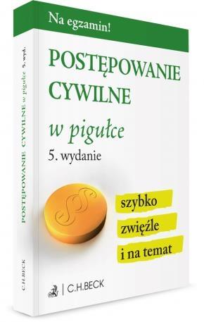 Wydanie czwarte uwzględnia zmiany wchodzące w życie 8.9.2016 r.! W opracowaniu uwzględniono następujące zagadnienia: organizacja i skład sądu, zasady i przesłanki postępowania cywilnego, właściwość sądu – rzeczowa, miejscowa, ogólna, szczególna, wartość przedmiotu sporu, wyłączenie sędziego, prokurator, organizacje pozarządowe, Państwowa Inspekcja Pracy, Rzecznik Konsumentów, strony – zdolność sądową, procesową, współuczestnictwo w sporze i interwencja procesowa, pełnomocnicy procesowi, koszty procesu, postępowanie – pisma procesowe, doręczenia, terminy, posiedzenia sądowe, zawieszenie, mediację, postępowanie pojednawcze, ugodę sądową, rozprawę, postępowanie dowodowe, orzeczenia – wyroki, natychmiastowa wykonalność, wyrok zaoczny, rektyfikację wyroków, nakaz zapłaty, postanowienia sądu, prawomocność, środki odwoławcze – apelacja, nieważność postępowania, zażalenie, skarga kasacyjna, skarga na orzeczenie referendarza sądowego, wznowienie postępowania, skarga o stwierdzenie niezgodności z prawem prawomocnego orzeczenia, postępowania odrębne – w sprawach małżeńskich, o rozwód i separację, w sprawach ze stosunków między rodzicami a dziećmi, w sprawach z zakresu prawa pracy i ubezpieczeń społecznych, w sprawach z zakresu konkurencji, w sprawie o uznanie postanowień wzorca umowy za niedozwolone, postępowanie nakazowe i upominawcze, elektroniczne postępowanie upominawcze, postępowanie nieprocesowe – z zakresu prawa osobowego, z zakresu prawa rodzinnego, opiekuńczego i kurateli, zakresu prawa rzeczowego, zakresu prawa spadkowego, postępowanie rejestrowe, zabezpieczające i egzekucyjne, sąd polubowny – zapis na sąd polubowny, właściwość, postępowanie, wyrok, skarga o uchylenie wyroku. Wydanie czwarte zostało wzbogacone o pytania otwarte, wraz z odpowiedziami, które pozwolą sprawdzić stopień przygotowania do egzaminu lub kolokwium. Prawo w pigułce: Przejrzyste wykresy, Pomocne tabele, Wyróżnienia informacyjne Poręczny Format - 117mm x 170 mm