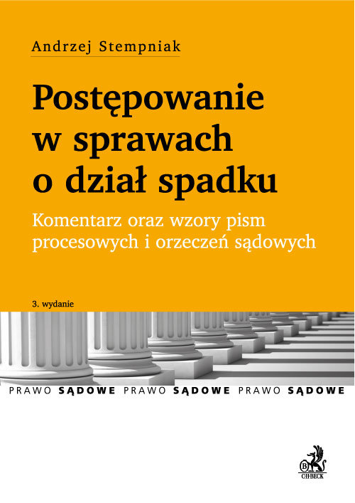 Postępowanie w sprawach o dział spadku. Komentarz praktyczny z orzecznictwem. Wzory pism procesowych i orzeczeń sądowych to publikacja, która stanowi kompleksowe omówienie zagadnień związanych z postępowaniem w sprawach o dział spadku. Postępowanie w sprawach o dział spadku omówione w niniejszej publikacji uwzględnia aktualny stan prawny i opiera się na obowiązujących przepisach ustawy z 17.11.1964 r. – Kodeks postępowania cywilnego (t.j. Dz.U. z 2016 r. poz. 1822 ze zm.) (Rozdział 9 KPC – art. 680–689). Dział spadku to pojęcie prawne określające wartość majątku wchodzącego w skład spadku oraz dokonujące podziału majątku między spadkobierców. Niniejsze, 3. wydanie to praktyczny poradnik, który: wyczerpująco i szczegółowo omawia wszystkie zagadnienia związane z działem spadku oraz procedurę dotyczącą tego postępowania, uwzględnia najnowszy stan prawny, został wzbogacony o najnowsze i najważniejsze orzecznictwo i literaturę oraz nowe wzory pism procesowych, zapewni fachową pomoc w rozwiązywaniu problemów z zakresu postępowania o dział spadku. W prezentowanej publikacji Autor nie ogranicza się jedynie do przepisów formalnoprawnych, lecz odwołuje się także do dość szerokiego spektrum różnego rodzaju żądań pozostających w związku z dokonywanym podziałem substancji majątkowej. Co więcej, znajdziemy w niej dokładne omówienie całej procedury postępowania w sprawie podziału spadku. W niniejszej publikacji omówione zostały zagadnienia takie jak m.in.: podmioty postępowania o dział spadku, wszczęcie postępowania, zakres kognicji sądu I instancji, podział spadku, rodzaje postanowień co do istoty sprawy w postępowaniu o dział spadku, zagadnienia szczególne postępowania o dział spadku. Książka zawiera również wzory pism procesowych z prezentowanego zakresu. Są to m.in.: wniosek o dział spadku, wniosek o dział spadku i podział majątku wspólnego, umowa o dział spadku, apelacja, skarga kasacyjna. Prezentowana publikacja skierowana jest do sędziów, adwokatów, radców prawnych i notariuszy. Może ona także stanowić niezbędną pomoc dla studentów, aplikantów kierunków prawniczych oraz samych spadkobierców stojących przed wyborem drogi prowadzącej do zniesienia wspólności majątku spadkowego i podziału spadku.