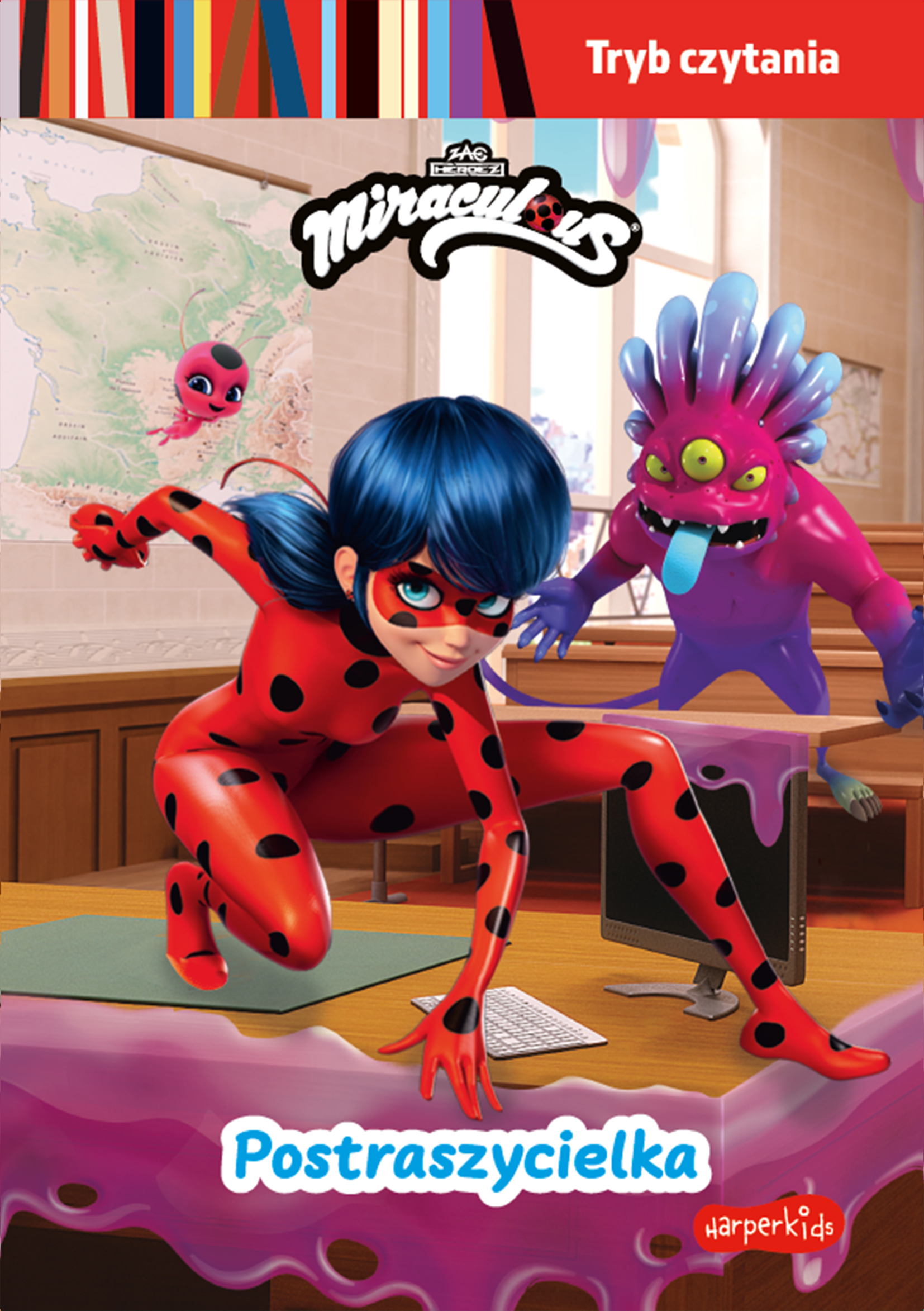 Mylene gra główną rolę w strasznym horrorze. Ale potwór, któremu ma stawić czoła w filmie, przeraża ją tak bardzo, że nie jest w stanie dobrze zagrać swej postaci. Niegodziwy Władca Ciem postanawia to wykorzystać i zamienia Mylene w Postraszycielkę. Złe alter ego Mylene sieje postrach w szkole, uprowadza uczniów, a budynek pokrywa tajemniczą różową mazią. Biedronka i Czarny Kot muszą schwytać i unieszkodliwić Postraszycielkę, by prawdziwa Mylene wróciła! Trzymająca w napięciu historia, prosty tekst i efektowne ilustracje zapraszają do lektury. Książkę łatwo przeczytać samodzielnie, co daje satysfakcję i rozbudza apetyt na kolejne tytuły!