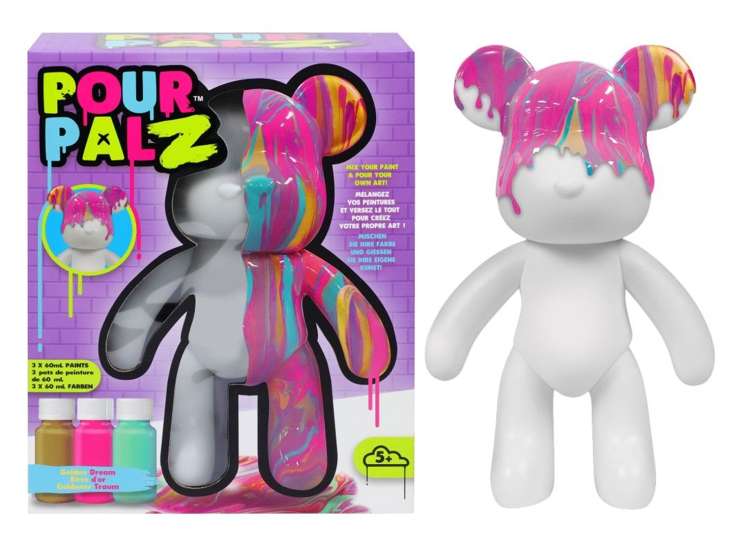 Zawartość: - 1 figurka dużego misia Pour Palz, - 3 farby 40ml każda, - 1 łyżka do przelewania, - 1 folia zabezpieczająca, - 1 kubek do mieszania, - 1 rękawiczka