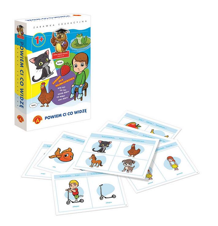 Zestaw składa się 32 plansz z obrazkami przedstawiającymi obiekty z najbliższego otoczenia dzieci. Dzięki odpowiednio zadawanym pytaniom stymulujemy naukę mowy oraz ćwiczymy poprawne budowanie wypowiedzi. Zabawka pomaga w nauce nazywania rzeczy, czynności, określania położenia oraz cech przedmiotów, odróżniania liczby pojedynczej od mnogiej oraz tworzenia odpowiedniej formy gramatycznej wypowiedzi.