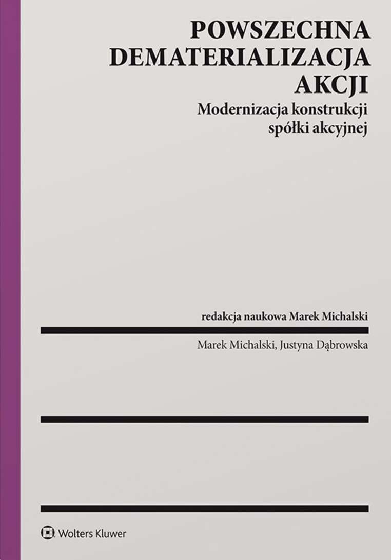 W książce przedstawiono problematykę dematerializacji akcji oraz wpływu  odejścia od koncepcji akcji w formie dokumentowej, a zatem niezwykle  ważnej zmiany przepisów, obowiązującej od 1 marca 2021 r., istotnej z  punktu widzenia spółki akcyjnej. Skomentowano zasady  funkcjonowania spółki akcyjnej oraz omówiono zmienione przez  dematerializację akcji reguły określające wykazywanie legitymacji  akcjonariuszy względem spółki oraz wykonywania przez nich uprawnień  majątkowych i korporacyjnych, wynikających ze zdematerializowanych  akcji.