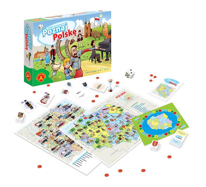 na województwa, z zaznaczeniem ich stolic, prezentacją strojów ludowych i przedstawieniem najciekawszych obiektów i miejsc na terenie naszego kraju. Zawartość zestawu ,,Poznaj Polskę"" jest różnorodna i uniwersalna - skierowana zarówno do najmłodszych, jak i do dorosłych. Zestaw zawiera kilka gier - planszówkę, quiz historyczny, grę ,,Pamięć"" oraz ,,Piotruś"".