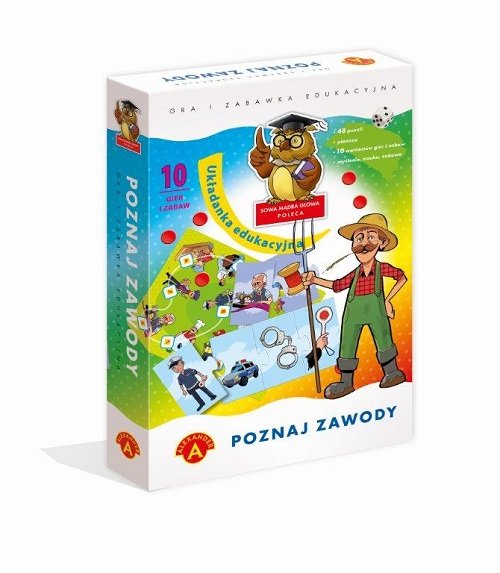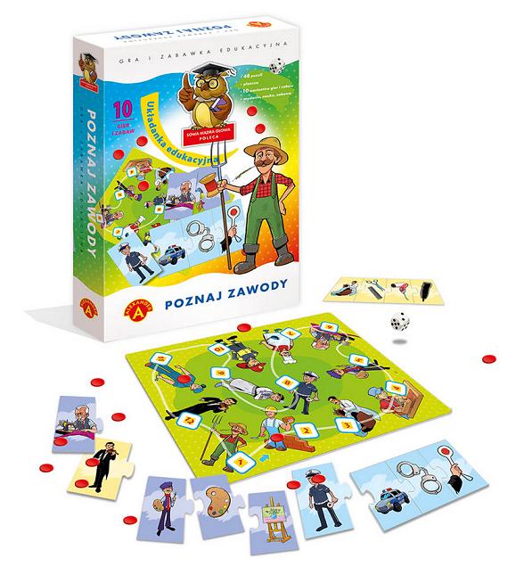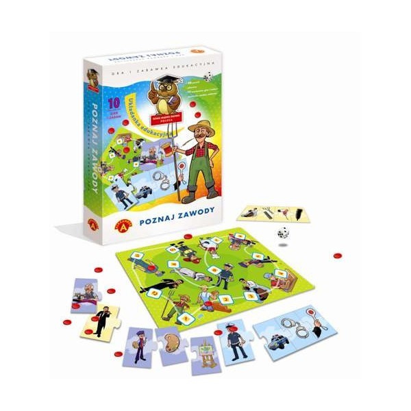 "Poznajemy zawody" to gry i zabawy, a także pomoc dydaktyczna dla dzieci w wieku przedszkolnym. Warianty zabawy, podczas których należy skojarzyć obrazki, dostarczają dzieciom wiadomości na temat różnych zawodów i narzędzi potrzebnych do ich wykonywania. Rozwijają umiejętność samodzielnej wypowiedzi, koncentrację, logiczne myślenie, pamięć, wyobraźnię oraz sprawność manualną. Dzieci mogą bawić się indywidualnie lub w większym gronie. Bardzo pomocny przy zabawie może być dorosły opiekun, który wyjaśni prawidłowo jej zasady i zwróci uwagę na jej prawidłowy przebieg. Zawartość pudełka: 48 puzzli, plansza, pionek, kostka, 40 żetonów, instrukcja. Liczba graczy: 1-4 Wiek 5+