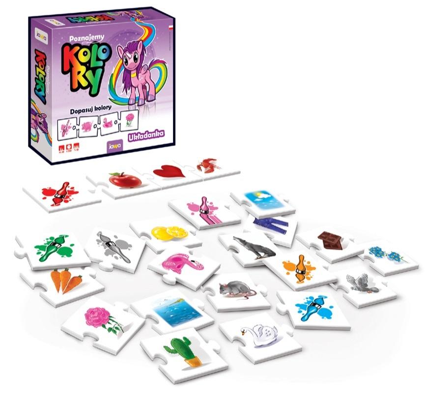 Świat wokół nas jest pełen kolorów. Układanka pomaga dzieciom w nauce rozpoznawania barw przedmiotów, roślin i zwierząt. Zestaw puzzli pozwala rozegrać 4 rodzaje gier: - dobieranie kolorów - memory kolory - memory kto pierwszy ten lepszy - słuchamy i układamy Wiek graczy: 4-6 Liczba graczy: 1-6 Czas rozgrywki: 30 minut