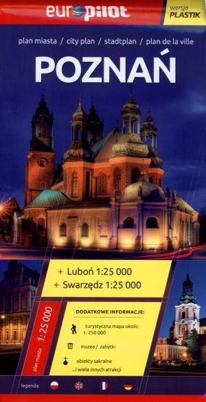 Plan miasta skala 1:25 000 laminowany GPS dodatkowo zawiera plany miast: Swarzędz, Luboń (1:25 000) plan centrum w skali 1:10 000, mapa okolic w skali 1:200 000, plany osiedli skala 1:12 500