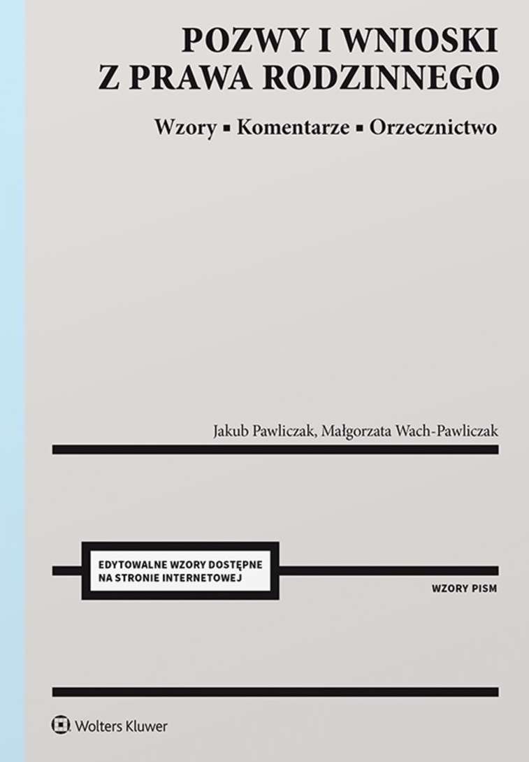 Wzory pozwów i wniosków w sprawach rodzinnych powstały jako rezultat doświadczeń w nauczaniu aplikantów zawodów prawniczych i studentów ostatnich lat studiów prawniczych oraz wieloletniej praktyki sądowej w prowadzeniu spraw rodzinnych. Opracowanie pozwala nie tylko opanować praktyczne umiejętności formułowania pism procesowych, lecz także przyswoić i ugruntować wiedzę z zakresu prawa rodzinnego. Książka składa się z trzynastu rozdziałów, z których każdy zawiera: przykładowy stan faktyczny, dostosowany do niego wzór pisma procesowego, praktyczny komentarz oraz wybór najważniejszego orzecznictwa. Omówione zostały wzory pism najczęściej występujących w praktyce, wykorzystywanych w sprawach rozpoznawanych zarówno w postępowaniu procesowym, jak i nieprocesowym. Podstawowym celem autorów było także przekazanie kompleksowej wiedzy teoretycznej dotyczącej omawianych zagadnień, wzbogaconej o adekwatne orzecznictwo sądów powszechnych. Publikacja jest przeznaczona dla radców prawnych i adwokatów, którzy w pracy zawodowej są zobligowani do sporządzania pism procesowych. Może również zainteresować osoby dopiero rozwijające swoje umiejętności prawnicze, w szczególności w ramach aplikacji, praktyk w kancelariach prawniczych czy też studiów prawniczych. Opracowanie zawiera wzory pism dostępne w wersji elektronicznej do pobrania ze strony www.prawo-rodzinne-pozwy-wnioski-wzory.wolterskluwer.pl po wpisaniu zamieszczonego w książce kodu aktywacyjnego. Wzory można modykować i dostosowywać do indywidualnych potrzeb.