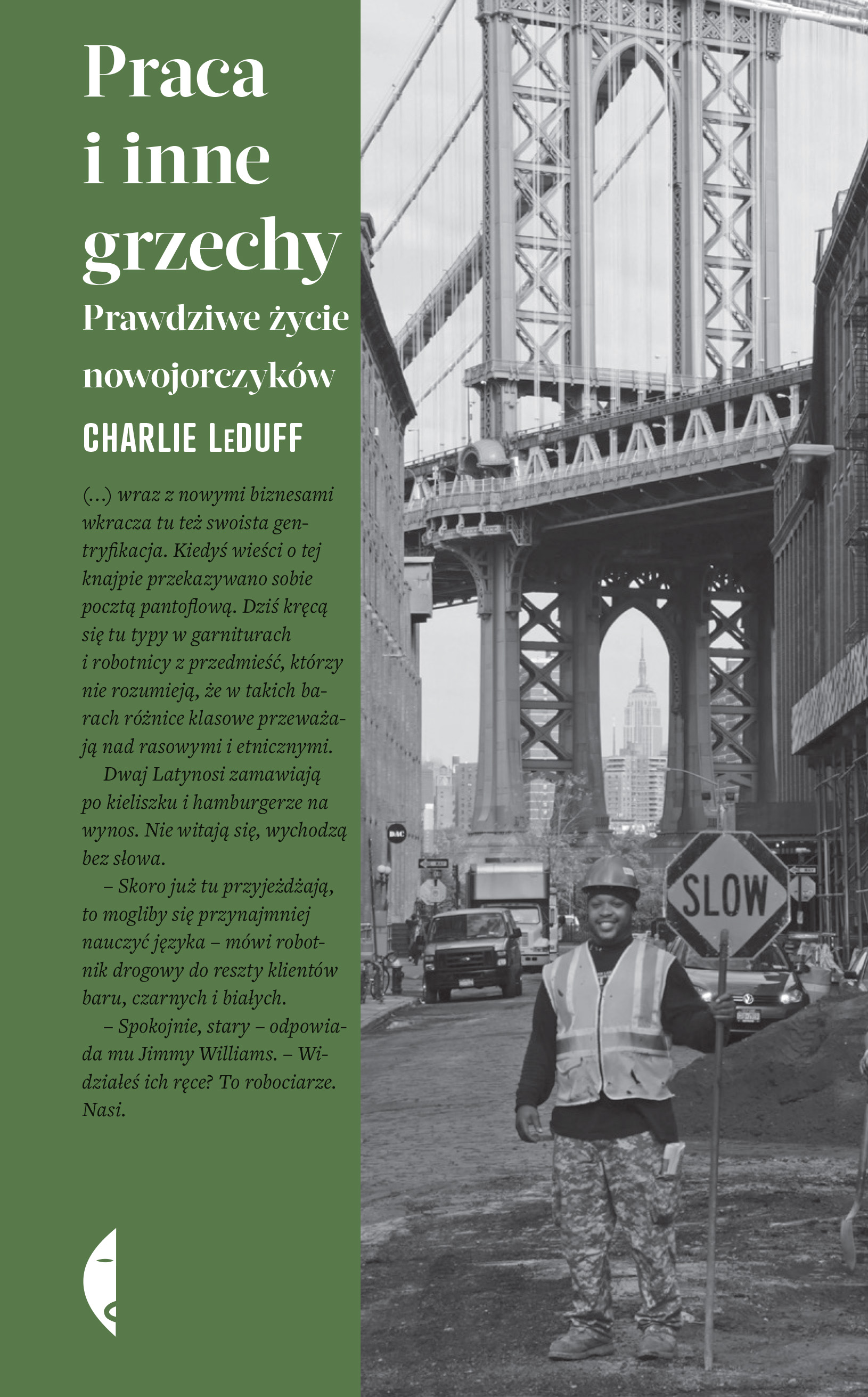 "Charlie LeDuff jest przemądrzały i irytujący. Mimo to, a może dlatego, potrafi utrzymać uwagę czytelnika. Ta książka to seria krótkich opowieści nie tyle o Stanach Zjednoczonych, ile o ludziach żyjących w Ameryce - przede wszystkim w amerykańskim oknie na świat, czyli Nowym Jorku - na przełomie XX i XXI wieku. Poznacie ostatniego latarnika w mieście, weteranów, świętego mikołaja, nastolatki na gigancie, narkomanów, podstarzałych lowelasów z klubów disco, pracowników rzeźni i zdesperowanych rybaków. "Praca i inne grzechy" to coś jak "Humans of New York", ale z czasów sprzed mediów społecznościowych." Łukasz Pawłowski, współtwórca "Podkastu amerykańskiego"
