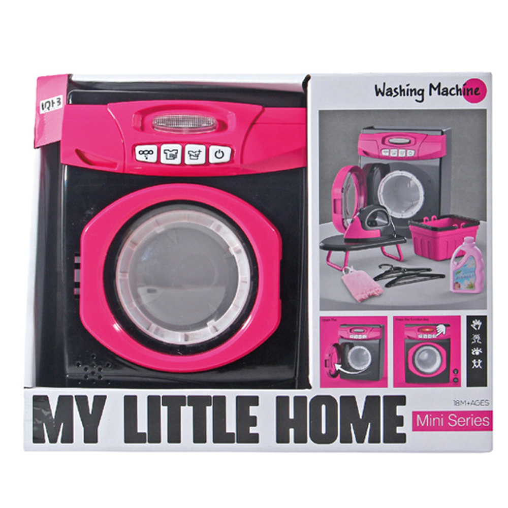 Pralka z dźwiękami i światłem. Zestaw zawiera również żelazko i deskę do prasowania, wieszaki, koszyk na pranie i buteleczkę z płynem do prania. Wymaga baterii: 3xAA (niedołączone) Wymiary opakowania: 26 x 9.8 x 20.8 cm
