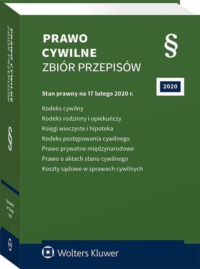 Stan prawny na 17 lutego 2020 r. Uwzględnia zmiany wchodzące w życie z dniem: KODEKS CYWILNY - 1 stycznia 2020 r., 1 czerwca 2020 r. – ustawa z 31 lipca 2019 r. o zmianie niektórych ustaw w celu ograniczenia obciążeń regulacyjnych (Dz.U. poz. 1495) KODEKS RODZINNY I OPIEKUŃCZY: - 30 października 2019 r. – obwieszczenie Marszałka Sejmu Rzeczypospolitej Polskiej z 18 października 2019 r. w sprawie ogłoszenia jednolitego tekstu ustawy – Kodeks rodzinny i opiekuńczy (Dz.U. poz. 2086) - 30 listopada 2019 r. – ustawa z 16 października 2019 r. o zmianie ustawy – Kodeks rodzinny i opiekuńczy oraz niektórych innych ustaw (Dz.U. poz. 2089) KSIĘGI WIECZYSTE I HIPOTEKA: - 14 listopada 2019 r. – obwieszczenie Marszałka Sejmu Rzeczypospolitej Polskiej z 18 października 2019 r. w sprawie ogłoszenia jednolitego tekstu ustawy o księgach wieczystych i hipotece (Dz.U. poz. 2204) KODEKS POSTĘPOWANIA CYWILNEGO: - 7 listopada 2019 r., 7 lutego 2020 r., 7 sierpnia 2020 r. – ustawa z 4 lipca 2019 r. o zmianie ustawy – Kodeks postępowania cywilnego oraz niektórych innych ustaw (Dz.U. poz. 1469 ze zm.) - 20 listopada 2019 r. – ustawa z 16 października 2019 r. o zmianie ustawy – Kodeks karny oraz ustawy – Kodeks postępowania cywilnego (Dz.U. poz. 2128) - 30 listopada 2019 r. – ustawa z 16 października 2019 r. o zmianie ustawy o ofercie publicznej i warunkach wprowadzania instrumentów finansowych do zorganizowanego systemu obrotu oraz o spółkach publicznych oraz niektórych innych ustaw (Dz.U. poz. 2217) - 1 stycznia 2020 r. – ustawa z 31 lipca 2019 r. o zmianie niektórych ustaw w celu ograniczenia obciążeń regulacyjnych (Dz.U. poz. 1495) - 1 stycznia 2020 r. – ustawa z 19 lipca 2019 r. o zmianie niektórych ustaw w celu ograniczenia zatorów płatniczych (Dz.U. poz. 1649) - 1 stycznia 2020 r. – ustawa z 19 lipca 2019 r. o realizowaniu usług społecznych przez centrum usług społecznych (Dz.U. poz. 1818) - 1 lipca 2020 r. – ustawa z 13 lutego 2020 r. o zmianie ustawy – Kodeks postępowania cywilnego oraz niektórych innych ustaw (druk sejmowy nr 45; oczekuje na podpis Prezydenta RP) - 30 lipca 2020 r., 30 października 2020 r., 20 lutego 2021 r., 30 października 2021 r. – ustawa z 11 września 2019 r. o zmianie ustawy o postępowaniu egzekucyjnym w administracji oraz niektórych innych ustaw (Dz.U. poz. 2070 ze zm.) - 1 grudnia 2020 r., 1 marca 2021 r. – ustawa z 26 stycznia 2018 r. o zmianie ustawy o Krajowym Rejestrze Sądowym oraz niektórych innych ustaw (Dz.U. poz. 398 ze zm.) - 1 grudnia 2020 r. – ustawa z 6 grudnia 2018 r. o Krajowym Rejestrze Zadłużonych (Dz.U. z 2019 r. poz. 55 ze zm.) - 1 stycznia 2021 r. – ustawa z 30 sierpnia 2019 r. o zmianie ustawy – Kodeks spółek handlowych oraz niektórych innych ustaw (Dz.U. poz. 1798 ze zm.) - 18 kwietnia 2026 r. – ustawa z 5 sierpnia 2015 r. o zmianie ustawy o ochronie konkurencji i konsumentów oraz niektórych innych ustaw (Dz.U. poz. 1634) - 30 dni od dnia ogłoszenia – ustawa z 9 stycznia 2020 r. o zmianie ustawy o transporcie kolejowym oraz niektórych innych ustaw (druk sejmowy nr 43; oczekuje na podpis Prezydenta RP).