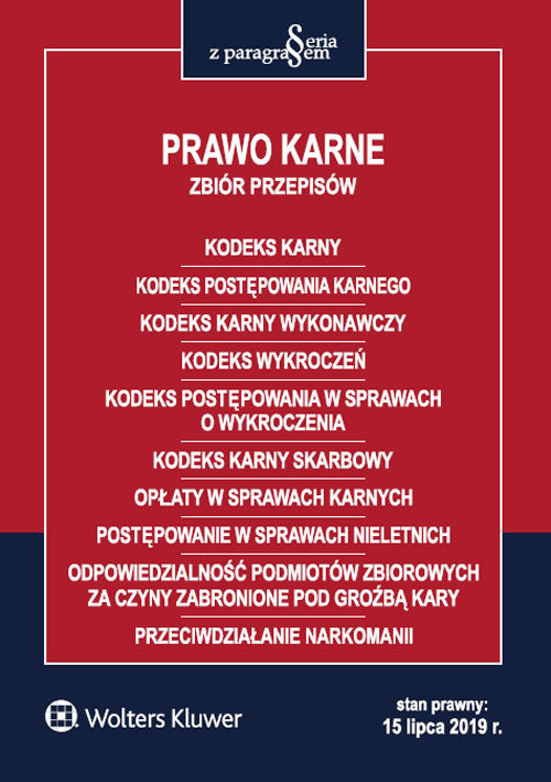 Stan prawny na 15 lipca 2019 r. Uwzględnia zmiany wchodzące w życie z dniem: KODEKS KARNY: - 4 maja 2019 r. - ustawa z 21 lutego 2019 r. o zmianie niektórych ustaw w związku z zapewnieniem stosowania rozporządzenia Parlamentu Europejskiego i Rady (UE) 2016/679 z dnia 27 kwietnia 2016 r. w sprawie ochrony osób fizycznych w związku z przetwarzaniem danych osobowych i w sprawie swobodnego przepływu takich danych oraz uchylenia dyrektywy 95/46/WE (ogólne rozporządzenie o ochronie danych) (Dz.U. poz. 730) - 9 maja 2019 r.- wyrok Trybunału Konstytucyjnego z 18 kwietnia 2019 r., K 14/17 (Dz.U. poz. 858) - 25 maja 2019 r. - ustawa z 15 marca 2019 r. o zmianie ustawy - Prawo o ruchu drogowym oraz ustawy - Kodeks karny (Dz.U. poz. 870) - 18 czerwca 2019 r. - wyrok Trybunału Konstytucyjnego z 11 czerwca 2019 r., P 20/17 (Dz.U. poz. 1135) KODEKS POSTĘPOWANIA KARNEGO: - 9 lutego 2019 r. - ustawa z 6 grudnia 2018 r. o zmianie ustawy o zawodach lekarza i lekarza dentysty oraz niektórych innych ustaw (Dz.U. z 2019 r. poz. 150) - 26 kwietnia 2019 r. - ustawa z 21 lutego 2019 r. o zmianie ustawy - Kodeks karny wykonawczy oraz ustawy - Kodeks postępowania karnego (Dz.U. poz. 679) - 23 czerwca 2019 r. - wyrok Trybunału Konstytucyjnego z 14 grudnia 2017 r., K 17/14 (Dz.U. poz. 2405) - 8 lipca 2019 r. - wyrok Trybunału Konstytucyjnego z 26 czerwca 2019 r. sygn. akt K 8/17 (Dz.U. poz. 1255) KODEKS KARNY WYKONAWCZY: - 11 kwietnia 2019 r. - obwieszczenie Marszałka Sejmu Rzeczypospolitej Polskiej z 15 marca 2019 r. w sprawie ogłoszenia jednolitego tekstu ustawy – Kodeks karny wykonawczy (Dz.U. poz. 676) - 26 kwietnia 2019 r. - ustawa z 21 lutego 2019 r. o zmianie ustawy - Kodeks karny wykonawczy oraz ustawy - Kodeks postępowania karnego (Dz.U. poz. 679) KODEKS WYKROCZEŃ: - 6 maja 2019 r. - obwieszczenie Marszałka Sejmu Rzeczypospolitej Polskiej z 4 kwietnia 2019 r. w sprawie ogłoszenia jednolitego tekstu ustawy - Kodeks wykroczeń (Dz.U. poz. 821) - 4 lipca 2019 r. - wyrok Trybunału Konstytucyjnego z 26 czerwca 2019 r., K 16/17 (Dz.U. poz. 1238) - 11 lipca 2019 r. - ustawa z 24 listopada 2017 r. o zmianie ustawy - Prawo o ruchu drogowym oraz niektórych innych ustaw (Dz.U. z 2018 r. poz. 79) - 18 kwietnia 2026 r.- ustawa z dnia 5 sierpnia 2015 r. o zmianie ustawy o ochronie konkurencji i konsumentów oraz niektórych innych ustaw (Dz.U. poz. 1634) KODEKS POSTĘPOWANIA W SPRAWACH O WYKROCZENIA: - 1 maja 2019 r., 1 listopada 2019 r. - ustawa z dnia 4 października 2018 r. o zmianie ustawy - Kodeks wykroczeń oraz niektórych innych ustaw (Dz.U. poz. 2077) - 17 czerwca 2019 r. - obwieszczenie Marszałka Sejmu Rzeczypospolitej Polskiej z 16 maja 2019 r. w sprawie ogłoszenia jednolitego tekstu ustawy - Kodeks postępowania w sprawach o wykroczenia (Dz.U. poz. 1120) - 23 czerwca 2019 r. - wyrok Trybunału Konstytucyjnego z 14 grudnia 2017 r., K 17/14 (Dz.U. poz. 2405) - 18 lipca 2019 r. - ustawa z 16 maja 2019 r. o Funduszu rozwoju przewozów autobusowych o charakterze użyteczności publicznej (Dz.U. poz. 1123) KODEKS KARNY SKARBOWY: - 30 kwietnia 2019 r. - ustawa z dnia 4 kwietnia 2019 r. o zmianie ustawy o wymianie informacji podatkowych z innymi państwami oraz niektórych innych ustaw (Dz.U. poz. 694) ODPOWIEDZIALNOŚĆ PODMIOTÓW ZBIOROWYCH ZA CZYNY ZABRONIONE POD GROŹBĄ KARY: - 3 kwietnia 2019 r. - obwieszczenie Marszałka Sejmu Rzeczypospolitej Polskiej z dnia 15 marca 2019 r. w sprawie ogłoszenia jednolitego tekstu ustawy o odpowiedzialności podmiotów zbiorowych za czyny zabronione pod groźbą kary (Dz.U. poz. 628) - 1 sierpnia 2019 r. - ustawa z 13 czerwca 2019 r. o wykonywaniu działalności gospodarczej w zakresie wytwarzania i obrotu materiałami wybuchowymi, bronią, amunicją oraz wyrobami i technologią o przeznaczeniu wojskowym lub policyjnym (Dz.U. poz. 1214)