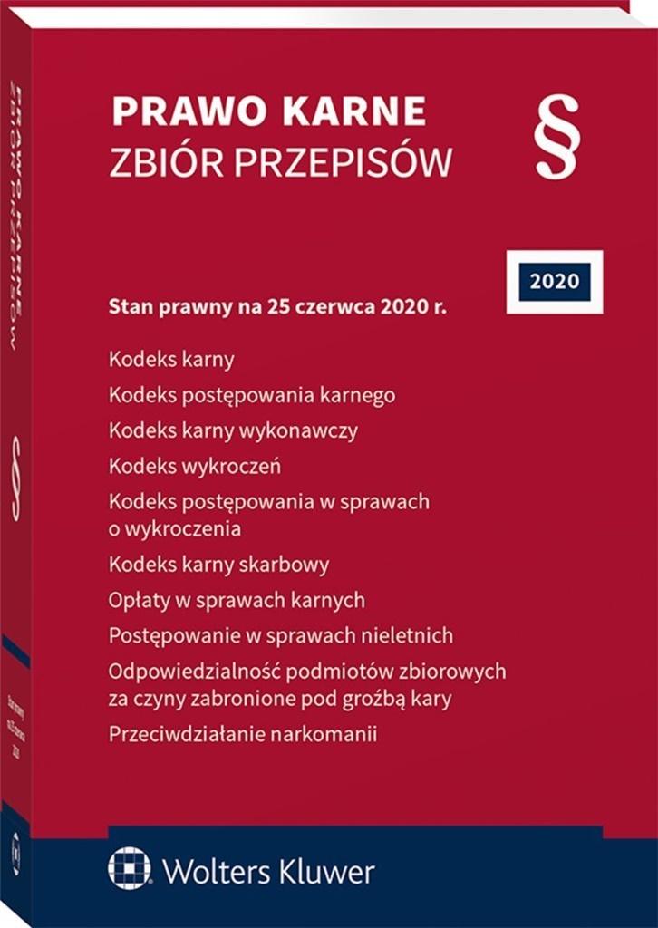 Stan prawny na 25 czerwca 2020 r. Uwzględnia zmiany wchodzące w życie z dniem: KODEKS KARNY: - 31 marca 2020 r. – ustawa z 31 marca 2020 r. o zmianie ustawy o szczególnych rozwiązaniach związanych z zapobieganiem, przeciwdziałaniem i zwalczaniem COVID-19, innych chorób zakaźnych oraz wywołanych nimi sytuacji kryzysowych oraz niektórych innych ustaw (Dz.U. poz. 568 ze zm.) - 30 maja 2020 r. – ustawa z 14 maja 2020 r. o zmianie niektórych ustaw w zakresie działań osłonowych w związku z rozprzestrzenianiem się wirusa SARS-CoV-2 (Dz.U. poz. 875) - 24 czerwca 2020 r. – ustawa z 19 czerwca 2020 r. o dopłatach do oprocentowania kredytów bankowych udzielanych przedsiębiorcom dotkniętym skutkami COVID-19 oraz o uproszczonym postępowaniu o zatwierdzenie układu w związku z wystąpieniem COVID-19 (Dz.U. poz. 1086) KODEKS POSTĘPOWANIA KARNEGO: - 12 marca 2020 r. – wyrok Trybunału Konstytucyjnego z 4 marca 2020 r., P 22/19 (Dz.U. poz. 413) - 31 marca 2020 r. – ustawa z 31 marca 2020 r. o zmianie ustawy o szczególnych rozwiązaniach związanych z zapobieganiem, przeciwdziałaniem i zwalczaniem COVID-19, innych chorób zakaźnych oraz wywołanych nimi sytuacji kryzysowych oraz niektórych innych ustaw (Dz.U. poz. 568 ze zm.) - 24 czerwca 2020 r. – ustawa z 19 czerwca 2020 r. o dopłatach do oprocentowania kredytów bankowych udzielanych przedsiębiorcom dotkniętym skutkami COVID-19 oraz o uproszczonym postępowaniu o zatwierdzenie układu w związku z wystąpieniem COVID-19 (Dz.U. poz. 1086) KODEKS KARNY WYKONAWCZY: - 25 marca 2020 r. – obwieszczenie Marszałka Sejmu Rzeczypospolitej Polskiej z 28 lutego 2020 r. w sprawie ogłoszenia jednolitego tekstu ustawy – Kodeks karny wykonawczy (Dz.U. poz. 523) - 31 marca 2020 r. – ustawa z 31 marca 2020 r. o zmianie ustawy o szczególnych rozwiązaniach związanych z zapobieganiem, przeciwdziałaniem i zwalczaniem COVID-19, innych chorób zakaźnych oraz wywołanych nimi sytuacji kryzysowych oraz niektórych innych ustaw (Dz.U. poz. 568 ze zm.) - 30 lipca 2020 r. – ustawa z 11 września 2019 r. o zmianie ustawy o postępowaniu egzekucyjnym w administracji oraz niektórych innych ustaw (Dz.U. poz. 2070 ze zm.) 1 stycznia 2021 r. – ustawa z 11 września 2019 r. – Przepisy wprowadzające ustawę – Prawo zamówień publicznych (Dz.U. poz. 2020).