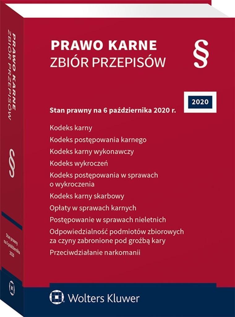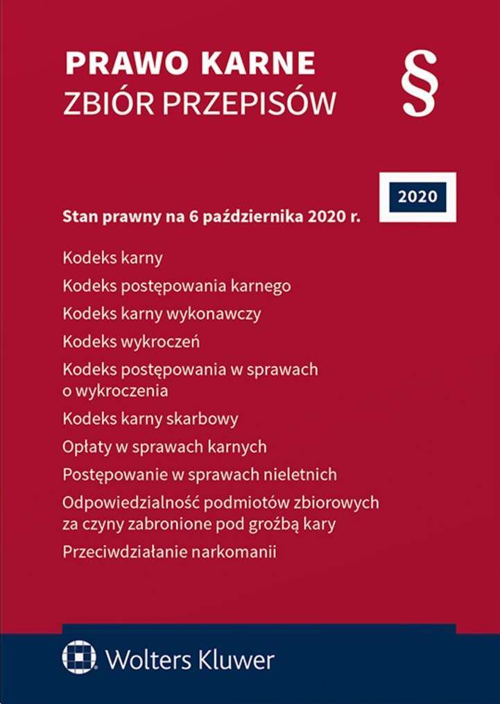 Stan prawny na 6 października 2020 r. Uwzględnia zmiany wchodzące w życie z dniem: KODEKS KARNY: - 25 sierpnia 2020 r. – obwieszczenie Marszałka Sejmu Rzeczypospolitej Polskiej z 15 lipca 2020 r. w sprawie ogłoszenia jednolitego tekstu ustawy – Kodeks karny (Dz.U. poz. 1444) - 5 grudnia 2020 r. – ustawa z 14 sierpnia 2020 r. o zmianie ustawy – Prawo o ruchu drogowym oraz niektórych innych ustaw (Dz.U. poz. 1517) KODEKS POSTĘPOWANIA KARNEGO: - 26 sierpnia 2020 r. – wyrok Trybunału Konstytucyjnego z 19 sierpnia 2020 r., K 46/15 (Dz.U. poz. 1458) KODEKS KARNY WYKONAWCZY: - 30 lipca 2020 r. – ustawa z 11 września 2019 r. o zmianie ustawy o postępowaniu egzekucyjnym w administracji oraz niektórych innych ustaw (Dz.U. poz. 2070 ze zm.) - 1 stycznia 2021 r. – ustawa z 11 września 2019 r. – Przepisy wprowadzające ustawę – Prawo zamówień publicznych (Dz.U. poz. 2020 ze zm.) KODEKS WYKROCZEŃ: - 30 listopada 2020 r. – ustawa z 30 kwietnia 2020 r. o zmianie ustawy – Kodeks postępowania cywilnego oraz niektórych innych ustaw (Dz.U. poz. 956) - 5 grudnia 2020 r. – ustawa z 14 sierpnia 2020 r. o zmianie ustawy – Prawo o ruchu drogowym oraz niektórych innych ustaw (Dz.U. poz. 1517) - 18 kwietnia 2026 r. – ustawa z 5 sierpnia 2015 r. o zmianie ustawy o ochronie konkurencji i konsumentów oraz niektórych innych ustaw (Dz.U. poz. 1634) KODEKS POSTĘPOWANIA W SPRAWACH O WYKROCZENIA: - 4 września 2020 r. – ustawa z 24 lipca 2020 r. o zmianie ustawy o delegowaniu pracowników w ramach świadczenia usług oraz niektórych innych ustaw (Dz.U. poz. 1423) - 30 listopada 2020 r. – ustawa z 30 kwietnia 2020 r. o zmianie ustawy – Kodeks postępowania cywilnego oraz niektórych innych ustaw (Dz.U. poz. 956) KODEKS KARNY SKARBOWY: - 1 lipca 2020 r. – ustawa z 28 maja 2020 r. o zmianie ustawy o podatku dochodowym od osób prawnych, ustawy o podatku od towarów i usług, ustawy o wymianie informacji podatkowych z innymi państwami oraz niektórych innych ustaw (Dz.U. poz. 1106) - 1 października 2020 r. – ustawa z 4 lipca 2019 r. o zmianie ustawy o podatku od towarów i usług oraz niektórych innych ustaw (Dz.U. poz. 1520 ze zm.).
