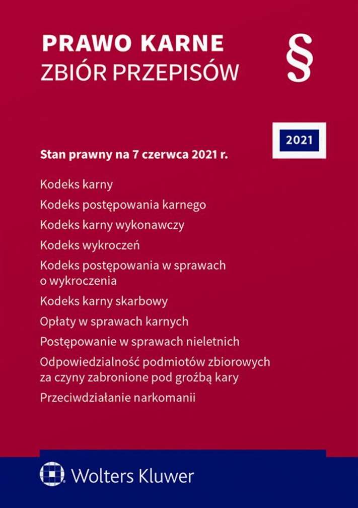 Stan prawny: 7 czerwca 2021 r Zbiór uwzględnia zmiany opublikowane do dnia 7 czerwca 2021 r UWZGLĘDNIA ZMIANY WCHODZĄCE W ŻYCIE Z DNIEM: KODEKS KARNY: 22 czerwca 2021 r. – ustawa z 20 kwietnia 2021 r. o zmianie ustawy – Kodeks karny oraz niektórych innych ustaw (Dz.U. poz. 1023) KODEKS POSTĘPOWANIA KARNEGO: 24 marca 2021 r. – obwieszczenie Marszałka Sejmu Rzeczypospolitej Polskiej z 1 marca 2021 r. w sprawie ogłoszenia jednolitego tekstu ustawy – Kodeks postępowania karnego (Dz.U. poz. 534) 22 czerwca 2021 r. – ustawa z 20 kwietnia 2021 r. o zmianie ustawy – Kodeks karny oraz niektórych innych ustaw (Dz.U. poz. 1023) 1 października 2028 r., 1 października 2029 r. – ustawa z 18 listopada 2020 r. o doręczeniach elektronicznych (Dz.U. poz. 2320) KODEKS KARNY WYKONAWCZY: 16 marca 2021 r. – wyrok Trybunału Konstytucyjnego z 11 marca 2021 r., SK 9/18 (Dz.U. poz. 472) KODEKS WYKROCZEŃ: 20 maja 2021 r. – ustawa z 30 marca 2021 r. o zmianie ustawy – Prawo o ruchu drogowym oraz niektórych innych ustaw (Dz.U. poz. 720) 22 czerwca 2021 r. – ustawa z 20 kwietnia 2021 r. o zmianie ustawy – Kodeks karny oraz niektórych innych ustaw (Dz.U. poz. 1023) 18 kwietnia 2026 r. – ustawa z 5 sierpnia 2015 r. o zmianie ustawy o ochronie konkurencji i konsumentów oraz niektórych innych ustaw (Dz.U. poz. 1634) KODEKS POSTĘPOWANIA W SPRAWACH O WYKROCZENIA: 17 czerwca 2021 r. – ustawa z 15 kwietnia 2021 r. o zmianie ustawy o autostradach płatnych oraz o Krajowym Funduszu Drogowym oraz niektórych innych ustaw (Dz.U. poz. 1005) 1 października 2029 r. – ustawa z 18 listopada 2020 r. o doręczeniach elektronicznych (Dz.U. poz. 2320 KODEKS KARNY SKARBOWY: 1 maja 2021 r. – ustawa z 30 marca 2021 r. o zmianie ustawy o podatku akcyzowym oraz niektórych innych ustaw (Dz.U. poz. 694) 1 lipca 2021 r. – ustawa z 18 listopada 2020 r. o doręczeniach elektronicznych (Dz.U. poz. 2320) ODPOWIEDZIALNOŚĆ PODMIOTÓW ZBIOROWYCH ZA CZYNY ZABRONIONE POD GROŹBĄ KARY: 12 miesięcy od dnia ogłoszenia – ustawa z 20 maja 2021 r. o ochronie praw nabywcy lokalu mieszkalnego lub domu jednorodzinnego oraz Deweloperskim Funduszu Gwarancyjnym (druk sejmowy nr 985, oczekuje na podpis Prezydenta RP)