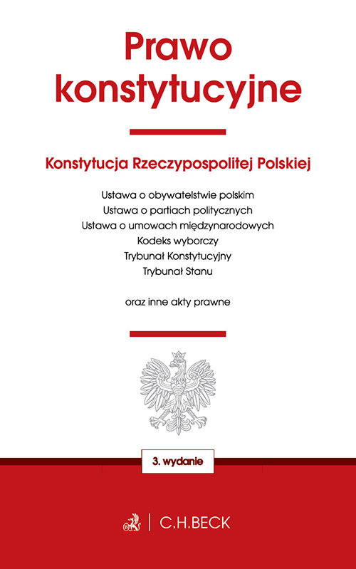 Publikacja zawiera: Konstytucja Rzeczypospolitej Polskiej Ustawa o obywatelstwie polskim Ustawa o umowach międzynarodowych Kodeks wyborczy Trybunał Konstytucyjny Trybunał Stanu oraz inne akty prawne Najbardziej aktualny stan prawny Czytelne hasła i tekst Przypisy od Redakcji Boldowanie najnowszych zmian Wybór najważniejszych aktów prawnych Indeks rzeczowy