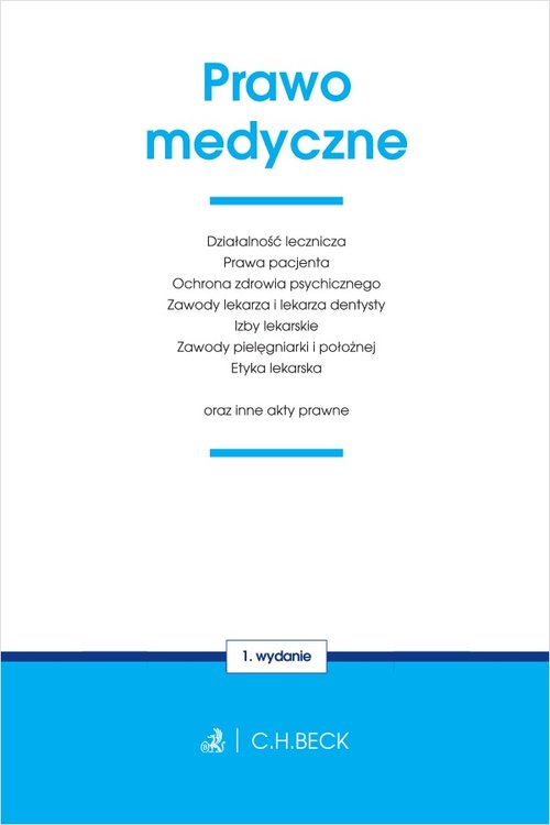 Stan prawny: 1 sierpnia 2019 r. Publikacja zawiera: Konstytucję Rzeczypospolitej Polskiej - wyciąg, Ustawę o działalności leczniczej - wyciąg, Ustawę o prawach pacjenta i Rzeczniku Praw Pacjenta, Ustawę o ochronie zdrowia psychicznego, Ustawę o zawodach lekarza i lekarza dentysty, Ustawę o izbach lekarskich, Ustawę o zawodach pielęgniarki i położnej, Ustawę o planowaniu rodziny, ochronie płodu ludzkiego i warunkach dopuszczalności przerywania ciąży, Ustawę o pobieraniu, przechowywaniu i przeszczepianiu komórek, tkanek i narządów, Ustawę o zapobieganiu oraz zwalczaniu zakażeń i chorób zakaźnych u ludzi, Ustawę o cmentarzach i chowaniu zmarłych - wyciąg, Ustawę o przeciwdziałaniu narkomanii, Ustawę o wychowaniu w trzeźwości i przeciwdziałaniu alkoholizmowi, Prawo o ruchu drogowym - wyciąg, Kodeks postępowania karnego - wyciąg, Kodeks postępowania cywilnego - wyciąg, Kodeks cywilny - wyciąg, Kodeks karny - wyciąg, Kodeks pracy - wyciąg, Kodeks etyki lekarskiej, Kodeks etyki zawodowej pielęgniarki i położnej Rzeczypospolitej Polskiej. Seria Teksty Ustaw Becka zawiera: Aktualny stan prawny Czytelne hasła i tekst Przypisy od Redakcji Wyróżnienie najnowszych zmian Wybór aktów prawnych Indeks rzeczowy