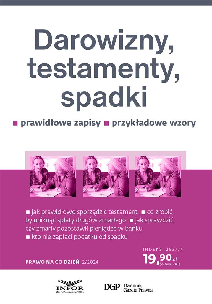 "Darowizny, testamenty, spadki" to praktyczny poradnik, który pomoże zaplanować wszystkie czynności związane z przekazaniem majątku, m. in. na wypadek śmierci. Autorka bardzo przystępnie wyjaśnia, jak prawidłowo i zgodnie z prawem dokonać darowizny, zawrzeć umowę o dożywocie bądź sporządzić testament. Szczegółowo omawia też zasady dziedziczenia ustawowego i testamentowego, skutki darowizny, a także sposób postępowania, by majątek darczyńcy lub spadkodawcy został przekazany zgodnie z obowiązującym prawem. Czytelnik dowie się z książki m. in.: kiedy testament ustny jest ważny, ile czasu ma spadkobierca na odrzucenie spadku, jak sporządzić wniosek o stwierdzenie nabycia spadku do sądu, czym jest zapis testamentowy, kto może żądać zachowku. Ponadto w poradniku "Darowizny, testamenty, spadki" wyjaśniono: jakie są rodzaje testamentów, jak przebiega dział spadku, na jakich zasadach dziedziczą dzieci w rodzinie zastępczej, jakie dane można uzyskać w Rejestrze Spadkowym, gdzie znaleźć informacje o rachunkach bankowych zmarłego, jak odrzucić spadek, co dzieje się z małą firmą po śmierci właściciela, kto może dziedziczyć gospodarstwo rolne, czym jest umowa o dożywocie, jak prawidłowo zawrzeć umowę darowizny, czy darowizna wpływa na dziedziczenie. Poradnik zawiera także wzory umów, testamentów i wniosków w postepowaniu spadkowym. Objaśnia znaczenie najważniejszych postanowień umowy darowizny oraz umowy o dożywocie, które często są stosowane, aby jeszcze za życia przekazać majątek wskazanym osobom. Autorka poświęca także uwagę opodatkowaniu otrzymanych spadków i darowizn. Wskazuje, kto może nie płacić podatku, a także jak obliczyć należny podatek i jaką deklarację należy przedłożyć do urzędu skarbowego. ATUTY PUBLIKACJI: Prosty język, praktyczne przykłady, wzory umów i wniosków, informacje o wysokości opłat sądowych i notarialnych sprawiają, że jest to najlepszy tego typu poradnik na polskim rynku