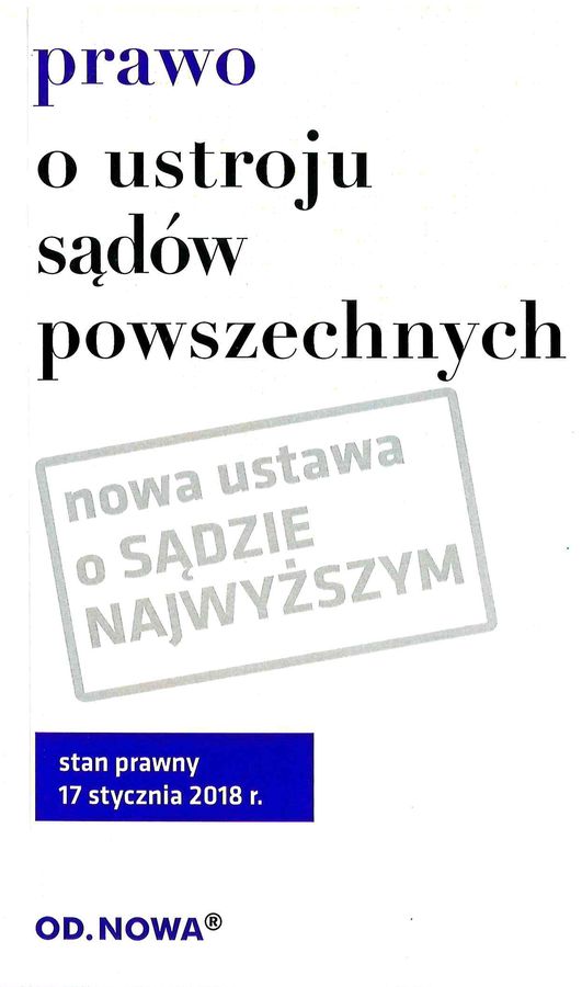 Publikacja zawiera aktualne, z uwzględnieniem gruntownych zmian, teksty ustaw: - Prawo o ustroju sądów powszechnych; - ustawę o Krajowej Radzie Sądownictwa oraz - ustawę o Sądzie Najwyższym, która wejdzie w życie w dniu 3 kwietnia 2018 r. W publikacji zamieszczono również przepisy zmieniające ww. ustawy, co pozwoli na śledzenie zmian, które aktualnie zachodzą. Poprzez system przypisów publikacja umożliwia studentom i praktykom łatwe śledzenie zmian prawnych. Zaletą książki jest jej praktyczny, poręczny format, przejrzysty układ graficzny i niska cena. Przepisy wchodzące w życie później niż podany stan prawny aktu prawnego ale już ogłoszone w Dzienniku Ustaw podajemy w ramkach z zachowaniem przepisu w dotychczas obowiązującym brzmieniu. Szczególnie pomocna dla: – studentów i wykładowców – osób przygotowujących się do egzaminów – aplikantów – osób ceniących sobie poręczny format, niewielkie gabaryty książki oraz przystępną cenę