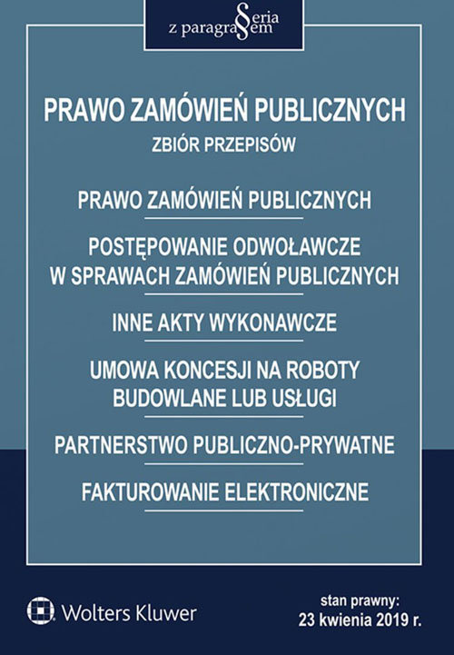 Stan prawny na 23 kwietnia 2019 r. Uwzględnia zmiany wchodzące w życie z dniem: PRAWO ZAMÓWIEŃ PUBLICZNYCH: - 28 lipca 2016 r., 1 stycznia 2017 r., 14 stycznia 2017 r., 14 lipca 2018 r. – ustawa z 22 czerwca 2016 r. o zmianie ustawy – Prawo zamówień publicznych oraz niektórych innych ustaw (Dz.U. poz. 1020 ze zm.) - 28 sierpnia 2018 r. – ustawa z 5 lipca 2018 r. o krajowym systemie cyberbezpieczeństwa (Dz.U. poz. 1560) - 19 września 2018 r. – ustawa z 5 lipca 2018 r. o zmianie ustawy o partnerstwie publiczno-prywatnym oraz niektórych innych ustaw (Dz.U. poz. 1693) - 1 października 2018 r. – ustawa z 3 lipca 2018 r. – Przepisy wprowadzające ustawę – Prawo o szkolnictwie wyższym i nauce (Dz.U. poz. 1669 ze zm.) - 16 października 2018 r. – obwieszczenie Marszałka Sejmu Rzeczypospolitej Polskiej z 3 października 2018 r. w sprawie ogłoszenia jednolitego tekstu ustawy – Prawo zamówień publicznych (Dz.U. poz. 1986) - 18 października 2018 r. – ustawa z 20 lipca 2018 r. zmieniająca ustawę – Prawo zamówień publicznych oraz ustawę o zmianie ustawy – Prawo zamówień publicznych oraz niektórych innych ustaw (Dz.U. poz. 1603) - 1 stycznia 2019 r. – ustawa z 4 października 2018 r. o pracowniczych planach kapitałowych (Dz.U. poz. 2215) - 4 maja 2019 r. – ustawa z 21 lutego 2019 r. o zmianie niektórych ustaw w związku z zapewnieniem stosowania rozporządzenia Parlamentu Europejskiego i Rady (UE) 2016/679 z dnia 27 kwietnia 2016 r. w sprawie ochrony osób fizycznych w związku z przetwarzaniem danych osobowych i w sprawie swobodnego przepływu takich danych oraz uchylenia dyrektywy 95/46/WE (ogólne rozporządzenie o ochronie danych) (Dz.U. poz. 730) - 12 lipca 2019 r. – ustawa z 22 listopada 2018 r. o dokumentach publicznych (Dz.U. z 2019 r. poz. 53) POSTĘPOWANIE ODWOŁAWCZE W SPRAWACH ZAMÓWIEŃ PUBLICZNYCH: REGULAMIN POSTĘPOWANIA PRZY ROZPOZNAWANIU ODWOŁAŃ: - 7 czerwca 2018 r. – obwieszczenie Prezesa Rady Ministrów z 7 maja 2018 r. w sprawie ogłoszenia jednolitego tekstu rozporządzenia (Dz.U. poz. 1092) - 18 października 2018 r. – rozporządzenie Prezesa Rady Ministrów z 17 października 2018 r. zmieniające nin. rozporządzenie (Dz.U. poz. 1992) WYSOKOŚĆ I SPOSÓB POBIERANIA WPISU OD ODWOŁANIA ORAZ RODZAJE KOSZTÓW W POSTĘPOWANIU ODWOŁAWCZYM I SPOSÓB ICH ROZLICZANIA: - 22 maja 2018 r. – obwieszczenie Prezesa Rady Ministrów z 7 maja 2018 r. w sprawie ogłoszenia jednolitego tekstu rozporządzenia (Dz.U. poz. 972) INNE AKTY WYKONAWCZE: RODZAJE DOKUMENTÓW, JAKICH MOŻE ŻĄDAĆ ZAMAWIAJĄCY OD WYKONAWCY W POSTĘPOWANIU O UDZIELENIE ZAMÓWIENIA: - 18 października 2018 r. – rozporządzenie Ministra Przedsiębiorczości i Technologii z 16 października 2018 r. zmieniające nin. rozporządzenie (Dz.U. poz. 1993) METODA KALKULACJI KOSZTÓW CYKLU ŻYCIA BUDYNKÓW ORAZ SPOSÓB PRZEDSTAWIANIA INFORMACJI O TYCH KOSZTACH: - 14 lipca 2018 r. – rozporządzenie Ministra Inwestycji i Rozwoju z 11 lipca 2018 r. (Dz.U. poz. 1357) – nowe UŻYCIE ŚRODKÓW KOMUNIKACJI ELEKTRONICZNEJ W POSTĘPOWANIU O UDZIELENIE ZAMÓWIENIA PUBLICZNEGO ORAZ UDOSTĘPNIANIE I PRZECHOWYWANIE DOKUMENTÓW ELEKTRONICZNYCH: - 18 października 2018 r. – rozporządzenie Prezesa Rady Ministrów z 17 października 2018 r. zmieniające nin. rozporządzenie (Dz.U. poz. 1991).
