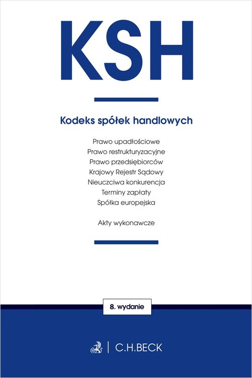 Stan prawny: 7 kwietnia 2020 r. Podwójnym stanem prawnym oznaczono treść artykułów, które wchodzą w życie: 24.3.2020 r. (Dz.U. z 2019 r. poz. 1802), 31.3.2020 r. (Dz.U. z 2020 r. poz. 568), 1.4.2020 r. (Dz.U. z 2020 r. poz. 480, poz. 550), 1.7.2020 r. (Dz.U. z 2020 r. poz. 288), 3.9.2020 r. (Dz.U. z 2019 r. poz. 2217; 2020 r. poz. 568), 1.12.2020 r. (Dz.U. z 2018 r. poz. 398; Dz.U. 2019 r. poz. 55, poz. 1802), 1.1.2021 r. (Dz.U. 2019 r. poz. 1798; Dz.U. z 2020 r. poz. 288), 1.3.2021 r. (Dz.U. z 2018 r. poz. 398; Dz.U z 2019 r. poz. 1655, poz. 1798; Dz.U z 2020 r. poz. 288). Publikacja zawiera: Kodeks spółek handlowych, Kodeks cywilny - wyciąg, Ustawę o Krajowym Rejestrze Sądowym, Prawo upadłościowe, Prawo restrukturyzacyjne, Prawo przedsiębiorców, Przepisy wprowadzające ustawę – Prawo przedsiębiorców oraz inne ustawy dotyczące działalności gospodarczej, Ustawę o zwalczaniu nieuczciwej konkurencji, Ustawę o przeciwdziałaniu nadmiernym opóźnieniom w transakcjach handlowych, Ustawę o europejskim zgrupowaniu interesów gospodarczych i spółce europejskiej, oraz 9 rozporządzeń. Książka adresowana jest do prawników oraz studentów prawa, dla których znajomość obowiązujących przepisów stanowi warunek prawidłowego wykonywania zawodu. Kolejne wydania publikacji uwzględniają najnowsze zmiany, przez co zapewniają bieżącą znajomość prawa. Aktualny stan prawny Czytelne hasła i tekst Przypisy od Redakcji Wyróżnienie najnowszych zmian Wybór aktów prawnych Indeks rzeczowy