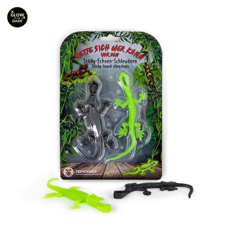 Schowaj się - jaszczurka nadlatuje! Ten zestaw procy z jaszczurką w metalicznym czarnym kolorze i jaszczurką w zielonym kolorze z efektem świecenia w ciemności jest absolutnie fajny dla wszystkich dzieci, które lubią straszyć i płatać figle. Wystarczy naciągnąć, wycelować i wystrzelić! W walce z przyjaciółmi możesz pokazać, jak daleko może polecieć Twoja jaszczurcza proca! Oto jak to działa: przełóż pętlę na głowie jaszczurki przez palec wskazujący, naciągnij ją drugą ręką, wyceluj w cel i wystrzel. Rozmiar każdej jaszczurki: około 13,0 x 4,0 cm. Uwaga: Łatwe do czyszczenia za pomocą letniej wody z mydłem. Może plamić - trzymać z dala od ubrań i mebli.