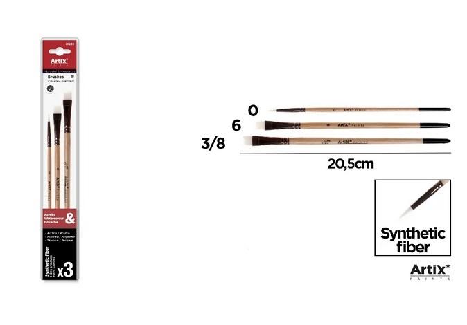 Profesjonalny pędzel z korpusem z naturalnego lakierowanegodrewna i czarną końcówką. Metalowa skuwkai białe syntetyczne włosie. Długość: 20 cm.Można je stosować z farbami akwarelowymi, akrylowymii temperowymi. Blister po 3 sztuki: 2 pędzlez skuwką i pędzel płaski o numerach 6 i 3/8idealny do wypełniania, wykonywania krawędzi ipociągnięć pędzlem; i okrągły pędzel nr 0 do wypełnianiamałych obszarów i mieszania farby z wodąw celu uzyskania technik na mokro, pociągnięćlub drobnych detali dzięki cienkiej końcówce.