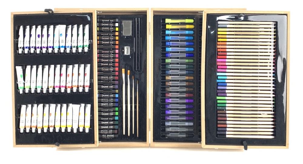 Duży Profesjonalny Zestaw Artystyczny Do Malowania w Drewnianej Walizce 174 elementy ! Dla Dzieci i Dorosłych Zestaw artystyczny dla dzieci i dorosłych, który świetnie sprawdzi się jako prezent na każdą okazję. Rysowanie i malowanie wpływa na prawidłowy rozwoju małej motoryki dziecka. Pobudza kreatywność, ale też ćwiczy mózg dziecka i przygotowuje go do nauki pisania. Wielokolorowy zestaw kredek, farb i flamastrów pozwala na długą zabawę i umożliwia dzielenie się zawartością z innymi dziećmi. Całość zapakowana w elegancką drewnianą walizkę z metalowymi zatrzaskami. Zestaw zawiera: - 34 Kredki Ołówkowe w intensywnych barwach - 42 Markery - 54 Pastele Olejne - 2 Ołówki - 4 Pędzle w różnych rozmiarach - 12 Farb Olejnych - 12 Farb Akwarelowych - 12 Farb Akrylowych - Gumka do wymazywania - Temperówka Wymiary opakowania: 45 cm x 31 cm 10 cm 174 Elementy - przy pomocy ogromnego wyboru z łatwością stworzymy najbardziej wymyślne, kreatywne i oryginalne prace. Całość umieszczona jest w drewnianej walizce, dzięki czemu transportowanie pełnej zawartości jest proste i komfortowe; dodatkowo posiada uchwyt umożliwiający wygodne przenoszeni. Po zużyciu pierwotnych przyborów, można z powodzeniem zapełnić walizkę nowymi, własnymi akcesoriami. Osobne przegródki dają łatwy i szybki dostęp do potrzebnych rzeczy, a także zapewniają ich ochronę oraz utrzymanie porządku w walizce; bez kłopotu zabierzemy ją ze sobą gdzie tylko zechcemy. Cały zestaw wygląda niezwykle efektownie i doskonale sprawdzi się jako prezent !