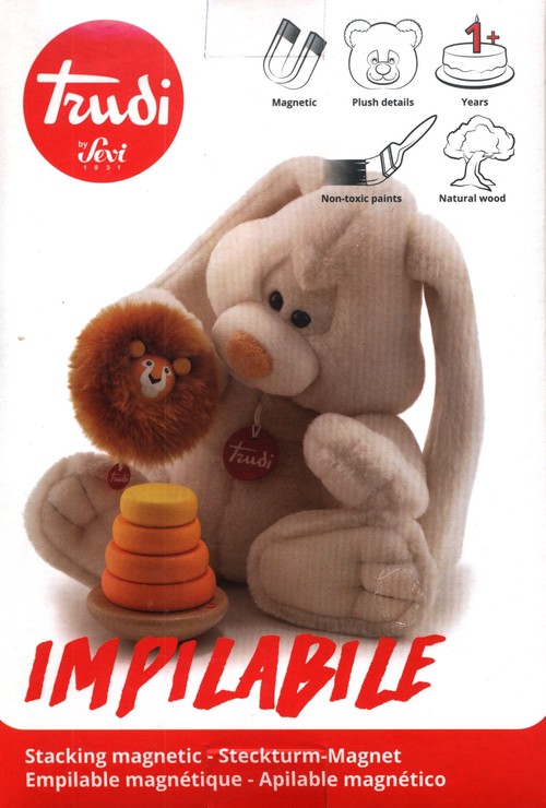 Piramidka składa się z drewnianych krążków z magnesami, które zakończone są uroczą główką lwa i zdejmowaną, puchatą grzywą. Zabawka wykonana jest z wysokiej jakości, drewnianych elementów.