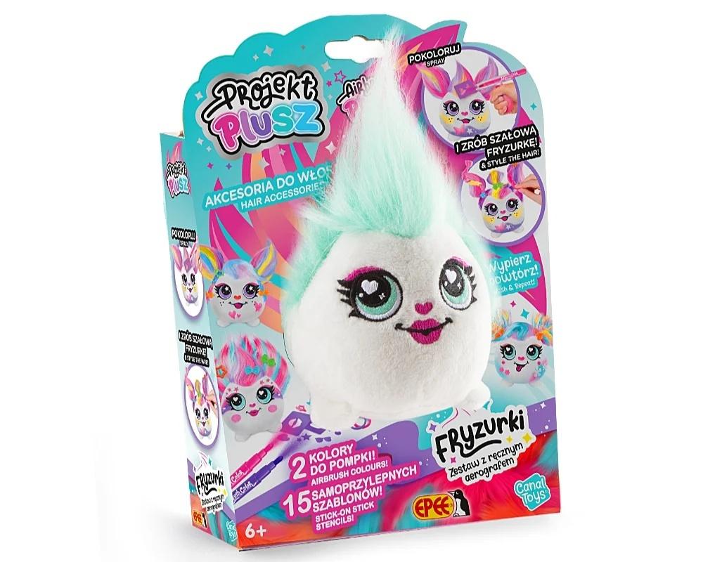 Udekoruj swojego pluszaka za pomocą pompki aerografu. To proste! Przyklej szablon i użyj sprayu, aby stworzyć fantastyczne wzory. Możesz nawet pokolorować mu włosy i stworzyć z nich szałową fryzurkę! A po zabawie, po prostu go wypierz i zacznij od nowa.