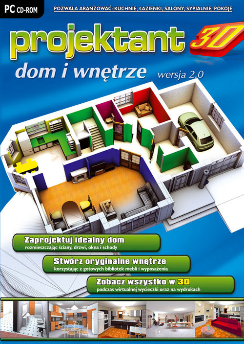 Projektant 3D Dom i Wnętrza wersja 2.0 To łatwy w obsłudze i dający duże możliwości projektowe program dla każdego, kto chciałby zaprojektować wygląd domu lub mieszkania oraz urządzić piękne wnętrza. Wszystko to można wykonać w zaledwie trzech krokach: 1. Zaprojektuj idealny dom – od fundamentów, przez ściany, aż po dach i elewację, rozmieszczając ściany, drzwi, okna i schody 2. Stwórz oryginalne wnętrza - korzystając z gotowych bibliotek mebli i wyposażenia 3. Zobacz wszystko w 3D - podczas wirtualnej wycieczki oraz na wydrukach UKŁAD POMIESZCZEŃ Pozwala zaprojektować bryłę domu, umożliwia łatwe rozplanowanie układu pomieszczeń i dopasowanie ich do indywidualnych wymagań. Pozwala rozmieścić drzwi, okna i schody różnych typów. Daje możliwość określenia wyglądu, kolorystyki i faktur każdego elementu domu. Projekt można uzupełnić opisami i liniami pomocniczymi oraz wymiarowymi. URZĄDZANIE WNĘTRZ Program pozwala stworzyć i urządzić oryginalne wnętrza z wykorzystaniem bibliotek gotowych elementów wyposażenia. Zawiera setki elementów pozwalających urządzać i zaaranżować kuchnie, łazienki, salony, sypialnie, pokoje dziecinne itd. Każdy element można modyfikować, zmieniając dowolnie wymiary oraz kolorystykę i faktury poszczególnych części. Program zawiera też zbiór roślin doniczkowych. WYGLĄD 3D W każdej fazie projektowania można zobaczyć i wydrukować wygląd projektu z dowolnego miejsca. Można też odbyć wirtualną trójwymiarową przechadzkę po projekcie, oglądając i zmieniając najmniejsze detale. DODATKOWO Program charakteryzuje się łatwą obsługą. Jest całkowicie w języku polskim, posiada instrukcję oraz rozbudowany system pomocy. Wymagania sprzętowe: komputer PC z procesorem 1 GHz, karta graficzna z 64 MB RAM, system Windows XP/7/8/10.