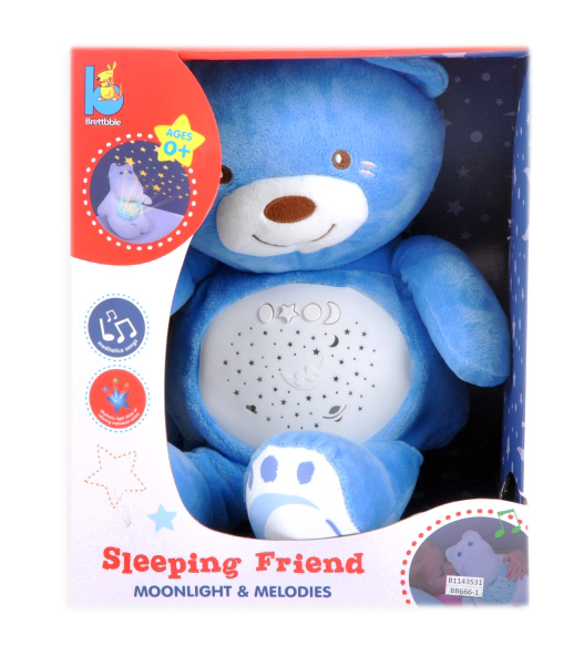 Zabawka posiada efekty dźwiękowe w postaci 8 melodii kołysanek a także świetlne i wizualne w postaci lampki oraz wizualizacji obrazkowej.