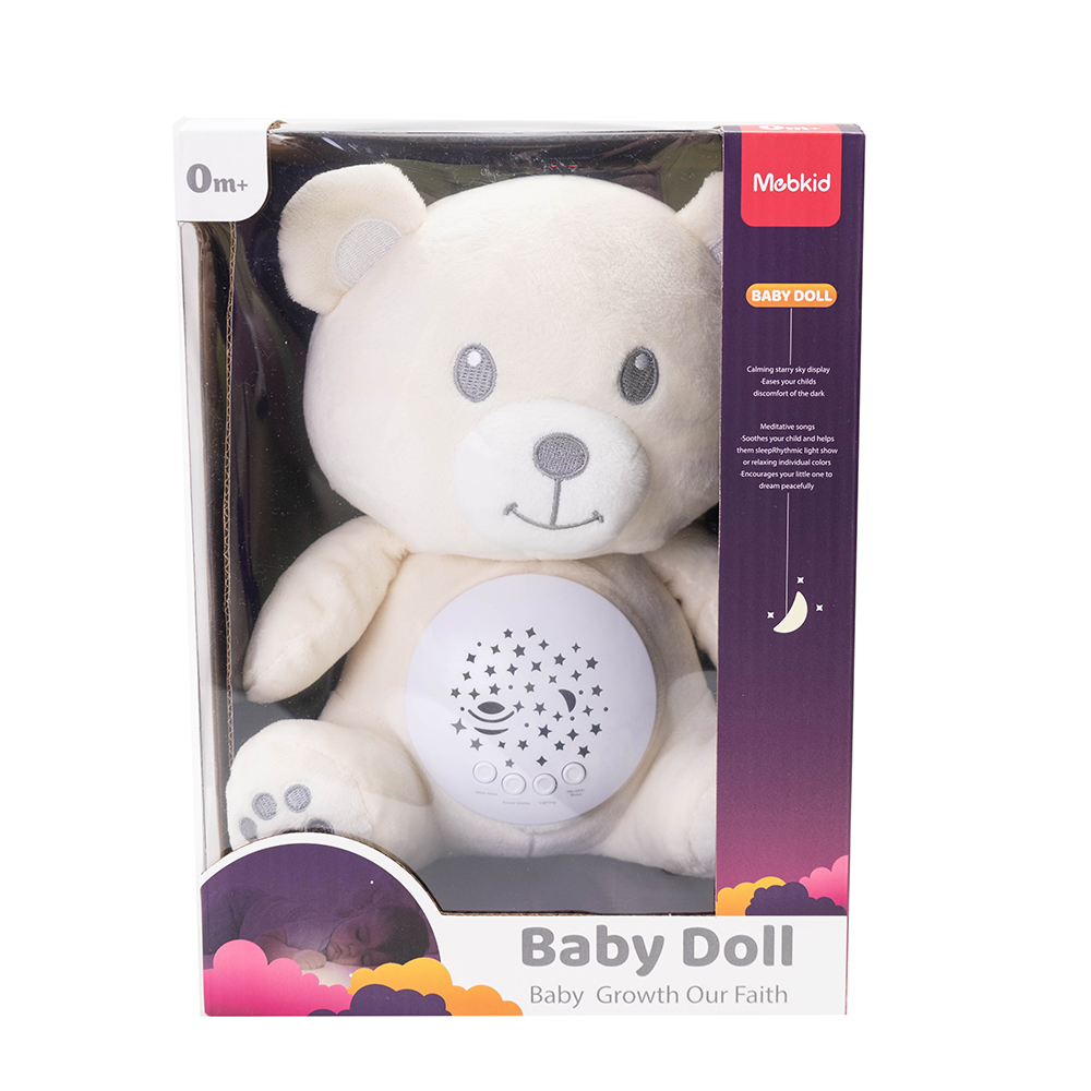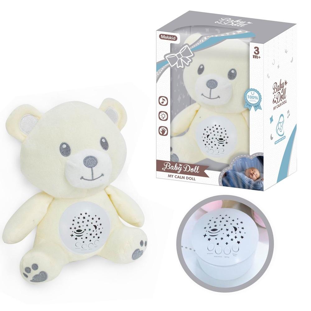 Projektor lampka - miś. Delikatne dźwięki muzyki. Kolorowy projektor, który wyświetla gwiazdki na ścianach lub suficie. Mechanizm można wyjąć i wyprać pluszaka. Wymiary opakowania: 26 x 19 x 14 cm.