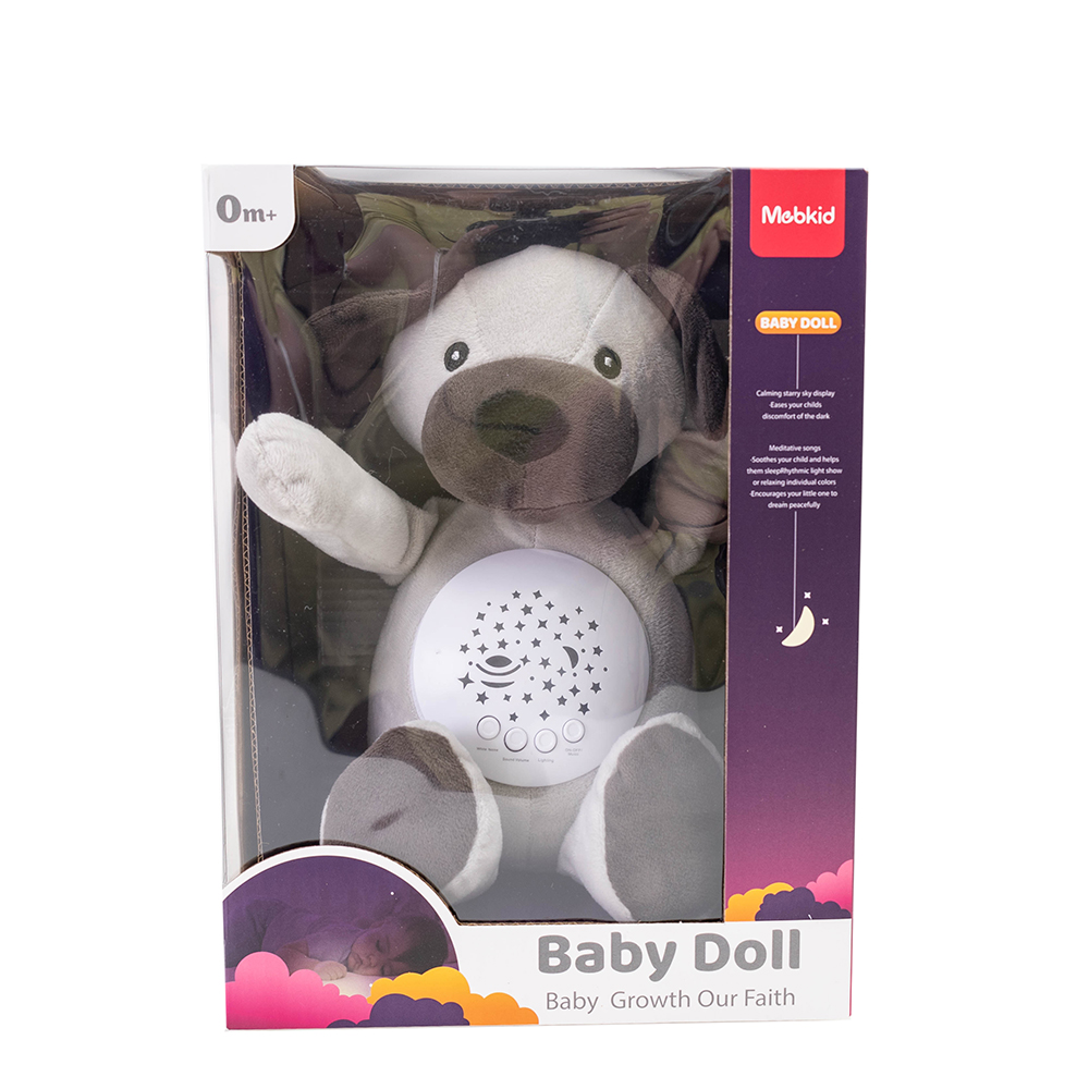 Projektor lampka - piesek. Delikatne dźwięki muzyki. Kolorowy projektor, który wyświetla gwiazdki na ścianach lub suficie. Mechanizm można wyjąć i wyprać pluszaka. Wymiary opakowania: 26 x 19 x 14 cm