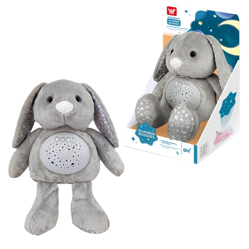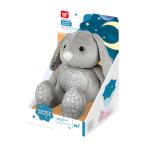 Projektor muzyczny - zajączek. Delikatne dźwięki muzyki, które można zmienić na szum fal. Kolorowy projektor, który wyświetla gwiazdki na ścianie lub suficie. Wymagane baterie - 2xAA (niedołączone). Wysokość zajączka - 34 cm.
