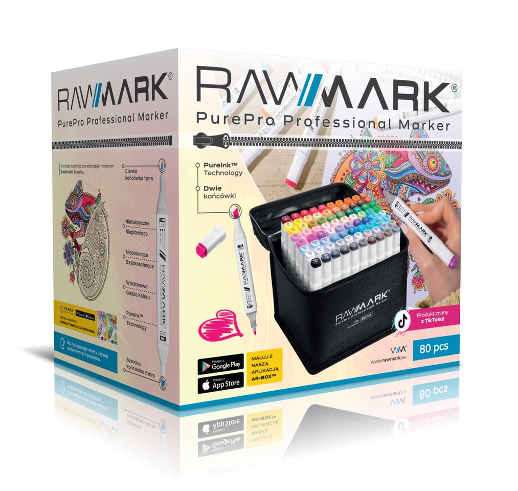PurePro to popularne promarkery alkoholowe. Markery ze specjalnym tuszem idealnie nadają się do zastosowań profesjonalnych oraz amatorskich prób i nauki. Dzięki nowej recepturze tuszu na bazie alkoholu kolory łączą się idealnie. Jest to kluczowe przy cieniowaniu. Jeżeli lubisz realistycznie wyglądające prace - docenisz to. - Tusz szybko wysycha co zapobiega rozmazywaniu oraz brudzeniu dłoni - Tusz wnika w papier dzięki czemu po wyschnięciu tworzy powłokę wodoodporną - Kolory nie blakną dzięki czemu długo cieszą wyrazistością Markery posiadają 2 końcówki: - 1 mm (okrągła) - 6 mm (płaska) Okrągła końcówka posiada szary znacznik dzięki temu od razu wiadomo którą stronę się otwiera. Pozwala to zaoszczędzić czas i wykonywać profesjonalnie swój szkic. PurePro często wykorzystywane są przez grafików i designerów przy: - projektowaniu produktów - projektowaniu wnętrz - grafikach artystycznych - grafikach do animacji - szkicowaniu Żywe kolory sprawiają, że grafiki tworzone za pomocą PurePro wyglądają profesjonalnie. Idealne są również na prezent, aby obudzić w kimś pasję szkicowania i rysowania w profesjonalnym wydaniu. Bogata paleta 80 kolorów pozwala na tworzenie grafik na różnorodnych powierzchniach: - papier - ściana - karton - ubrania Najlepsze efekty uzyskasz stosując papier przystosowany do markerów (np. Canson XL Marker). Dzięki specjalnej strukturze tusz pureINK nie przenika przez papier i nie "rozlewa się jak na zwykłym papierze". Jeśli potrzebujesz markerów z miękką końcówką pędzelkową - sprawdź markery RAWMARK Professional Brush Marker. Te produkty są często mylone.