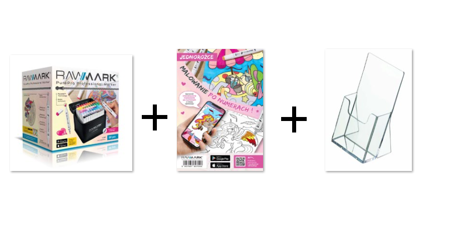 Promarkery alkoholowe Rawmark purePRO, 80 koloró +Kolorowanka interaktywna RAWMARK Jednorożce 15 kartek z aplikacją na telefon AR BOX w etui