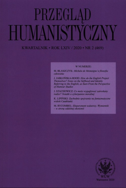 Numer ma charakter interdyscyplinarny. Zawiera artykuły poświęcone zagadnieniom należącym do historii myśli europejskiej (Marek Błaszczyk) i podejmujące problematykę jak najbardziej współczesną (Jerzy Stachowicz, Marlena Rycombel). Zamieszczone w nim teksty mają za przedmiot różne obszary szeroko rozumianej kultury: obyczajowość (Joanna Jabłońska-Hood), film (Kamil Lipiński), rzeźbę (Nina Nowara-Matusik). M. Błaszczyk: Michela de Montraigne'a filozofia człowieka J. Jabłońska-Hood: How to the English Project Themselves? Notes on the Selfhood and Identity Referring to the English, as Seen From the Perspective of Humor Studies J. Stachowicz: Co może wyguglować zatroskany rodzic? Notatki o cyberpanice moralnej K. Lipiński: Zachodnie spojrzenie na fantazmatyczne widoki Casablanki M. Rycombel: Eksperyment walutowy. Wymiennik - w stronę oddolnej ekonomii
