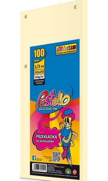 Przekładki tekturowe do segregatorów, wykonane z papieru o gramaturze 160gr, format 1/3 A4 24x10,5 cm,posiadają 4 otwory co umożliwia wpinanie w pionie oraz poziomie.