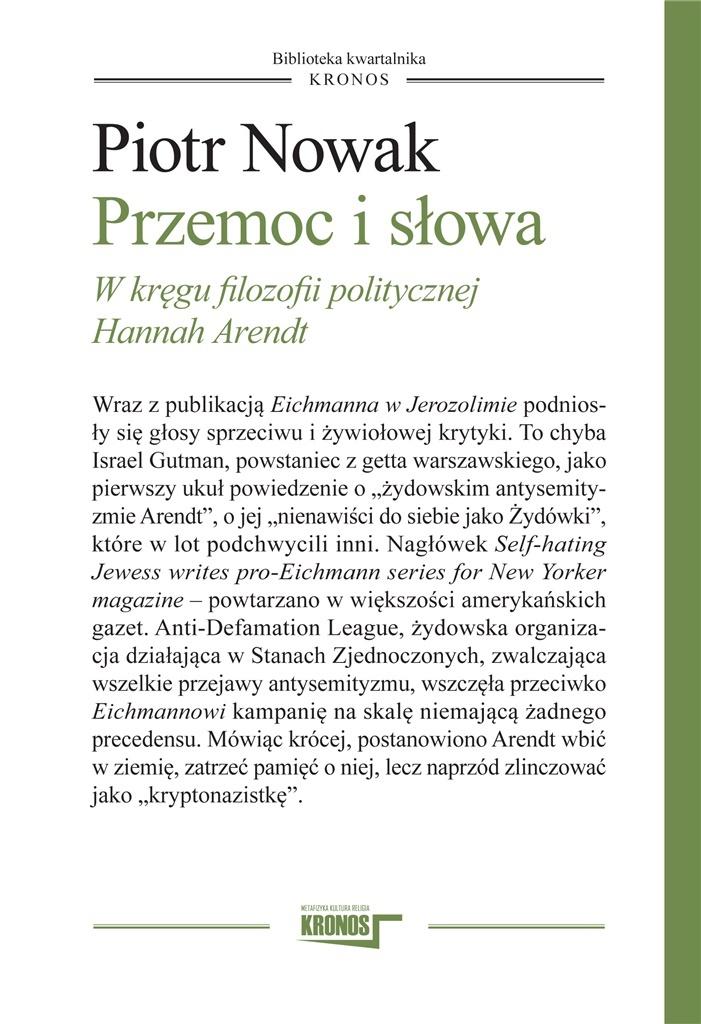 Wraz z publikacją Eichmanna w Jerozolimie podniosły się głosy sprzeciwu i żywiołowej krytyki. To chyba Israel Gutman, powstaniec z getta warszawskiego, jako pierwszy ukuł powiedzenie o „żydowskim antysemityzmie Arendt”, o jej „nienawiści do siebie jako Żydówki”, które w lot podchwycili inni. Nagłówek Self-hating Jewess writes pro-Eichmann series for New Yorker magazine – powtarzano w większości amerykańskich gazet. Anti-Defamation League, żydowska organizacja działająca w Stanach Zjednoczonych, zwalczająca wszelkie przejawy antysemityzmu, wszczęła przeciwko Eichmannowi kampanię na skalę niemającą żadnego precedensu. Mówiąc krócej, postanowiono Arendt wbić w ziemię, zatrzeć pamięć o niej, lecz naprzód zlinczować jako „kryptonazistkę”. Przed prawdziwym życiem, które zakłada odpowiedzialność za to, co się z nim robi, chroniły Eichmanna sztampa, klisze, wyświechtane zwroty, ideologia wypełniająca mu głowę obrazami wolnej od Żydów Europy. Gdyby zadał sobie trud postawienia paru elementarnych pytań – o sens okrucieństwa, sens wolności, o władzę i tytuł do zadawania cierpienia innym ludziom, o prawo do pozbawiania ich życia – być może oprzytomniałby i ocalił swą duszę. Myślenie bowiem podważa normy, które zastaje, pytając o ich prawomocność; z definicji nie tworzy sztywnego kodeksu zasad. Umożliwia wolny osąd. Ale i więcej: przerywa wszystkie inne czynności, odrywa od codziennej krzątaniny, od świata zjawisk z jego przetartymi drogami. W ten sposób myślenie upodabnia niejako żywych do umarłych. Wyłączając człowieka ze świata, sprawia, że staje się on bliższy samemu sobie; otwiera go na dialog, jaki prowadzi sam ze sobą.