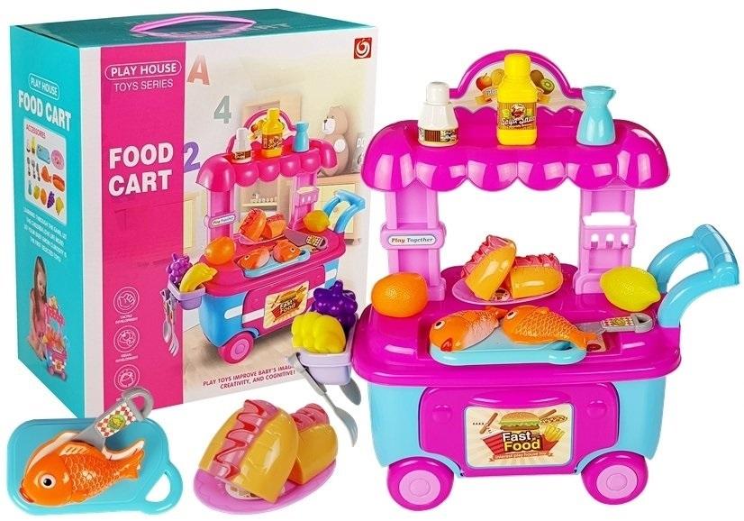Zestaw Food Cart to świetna zabawka dla wszystkich dzieci kochających wszelkie zabawy na straganie. Komplet składający się z wózeczka ozdobionego daszkiem , a także wielu plastikowych przysmaków, pozwoli dziecku na długą i wesołą zabawę. Możliwość wcielenia się w sprzedawcę z pewnością zachwyci każdego malucha. Kolorowe stoisko posiada kółka i rączkę, co znacznie ułatwia przemieszczanie się dziecka z małym sklepikiem. Pokrywa wózka jest ściągana, dzięki czemu właściciel kramiku może przechowywać w nim swój spożywczy asortyment.