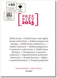 Zbiór Przepisy 2015 został przygotowany z myślą o praktykach prawa, sędziach, radcach prawnych, adwokatach oraz studentach prawa. Zadbaliśmy o wysoką jakość merytoryczną publikacji, wielką wagę przywiązaliśmy do opracowania graficznego - duża czcionka, zakupiona specjalnie na potrzeby tego wydawnictwa, nowoczesny layout, nagłówki artykułów ułatwiające wyszukiwanie informacji, skorowidz przedmiotowy oraz spis treści przed każdą z ustaw – to wszystko powinno ułatwić korzystanie z naszej publikacji. Zbiór karny ze stanem prawnym na 1 lipca 2015r. zawiera najnowsze przepisy składające się na fundamentalną reformę procedury karnej, jaka zacznie obowiązywać od lipca 2015r., a także równie fundamentalne zmiany kodeksu karnego, realizujące ideę nowej filozofii karania. W zbiorze uwzględniono przepisy przejściowe, ułatwiające orzekanie w pierwszym okresie po wejściu w życie nowych regulacji prawnych, a także zmiany dotyczące karania kierowców w znaczący sposób przekraczających dopuszczalna prędkość. Biorąc pod uwagę praktykę orzekania uznaliśmy za celowe opublikować także brzmienie części ogólnej Kodeksu karnego sprzed nowelizacji.