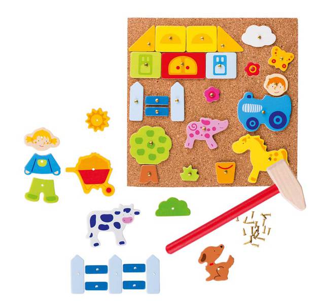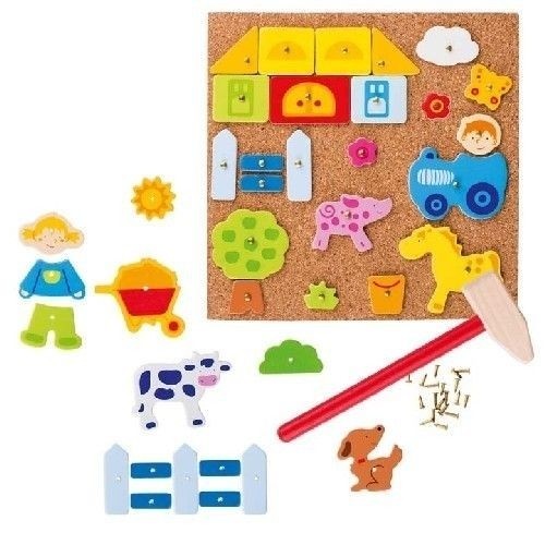 Zestaw do tworzenia historii o wiejskim życiu. Za pomocą młotka należy przybijać je do korkowej planszy, a powstaną obrazki, jakie tylko podpowie wyobraźnia. Opakowanie zawiera: planszę korkową, różnokolorowe drewniane elementy z dziurkami, metalowe pinezki do przybijania, drewniany młotek oraz kartę z wzorami. Wymiary planszy: 19 x 19 cm Produkt dopuszczony do obrotu w UE zgodnie z posiadanym certyfikatem CE oraz zgodnością z normą EN-71.
