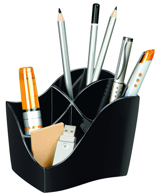 przybornik na biurko, wykonany z odpornego na pęknięcia i odkształcenia polistyrenu posiada 4 przegródki, dedykowane drobnym akcesoriom biurowym oraz artykułom piśmienniczym (mieści ok. 45 szt.) niepowtarzalny i oryginalnie zaprojektowany przybornik serii ISIS dodający ekstrawagancji w Twoim biurze futurystyczny i przyciągający wzrok design wymiary: 118x89x98mm posiada certyfikat BLAUER ANGEL kolor czarny