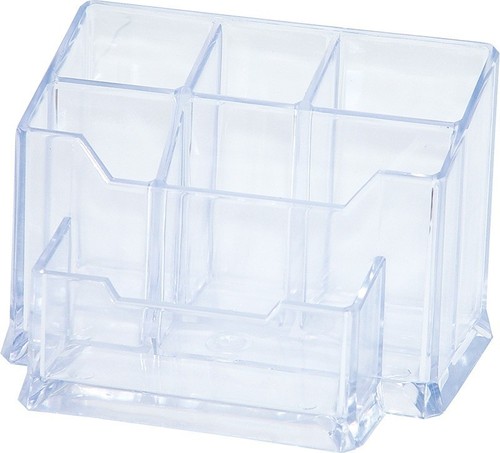 przybornik na biurko, wykonany z odpornego na pęknięcia polistyrenu 4 przegrody na akcesoria piszące 1 przegroda na karteczki (76x76mm) wymiary: 155x105x101mm kolor transparentny