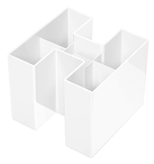 przybornik na biurko, wykonany z trwałego polistyrenu powierzchnie o wysokim połysku istnieje możliwość połączenia kilku pojemników w celu zwiększenia pojemności 4 przegrody na artykuły piszące 1 mini przegródka na spinacze stabilny - grubość ścianek 2mm wymiary: 109x109x90mm kolor biały